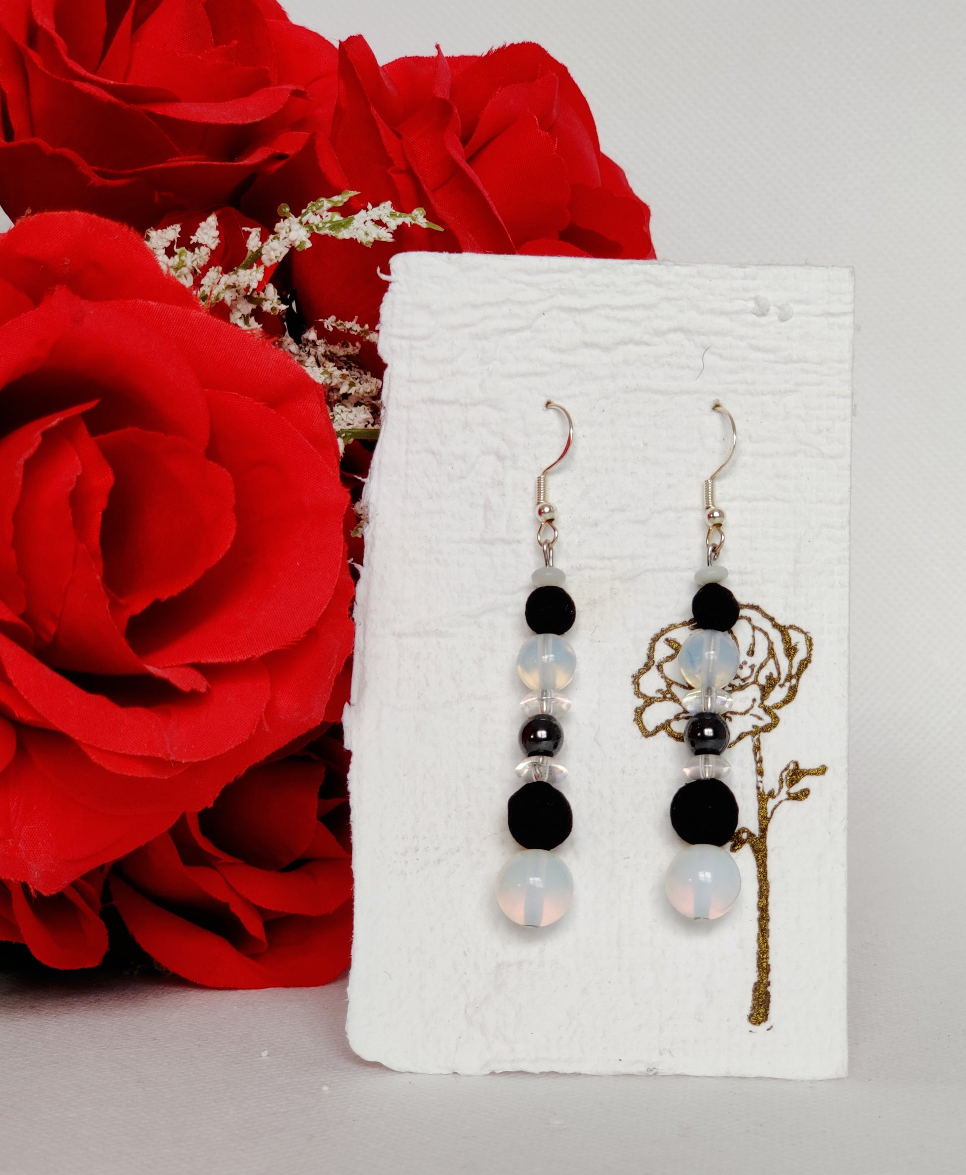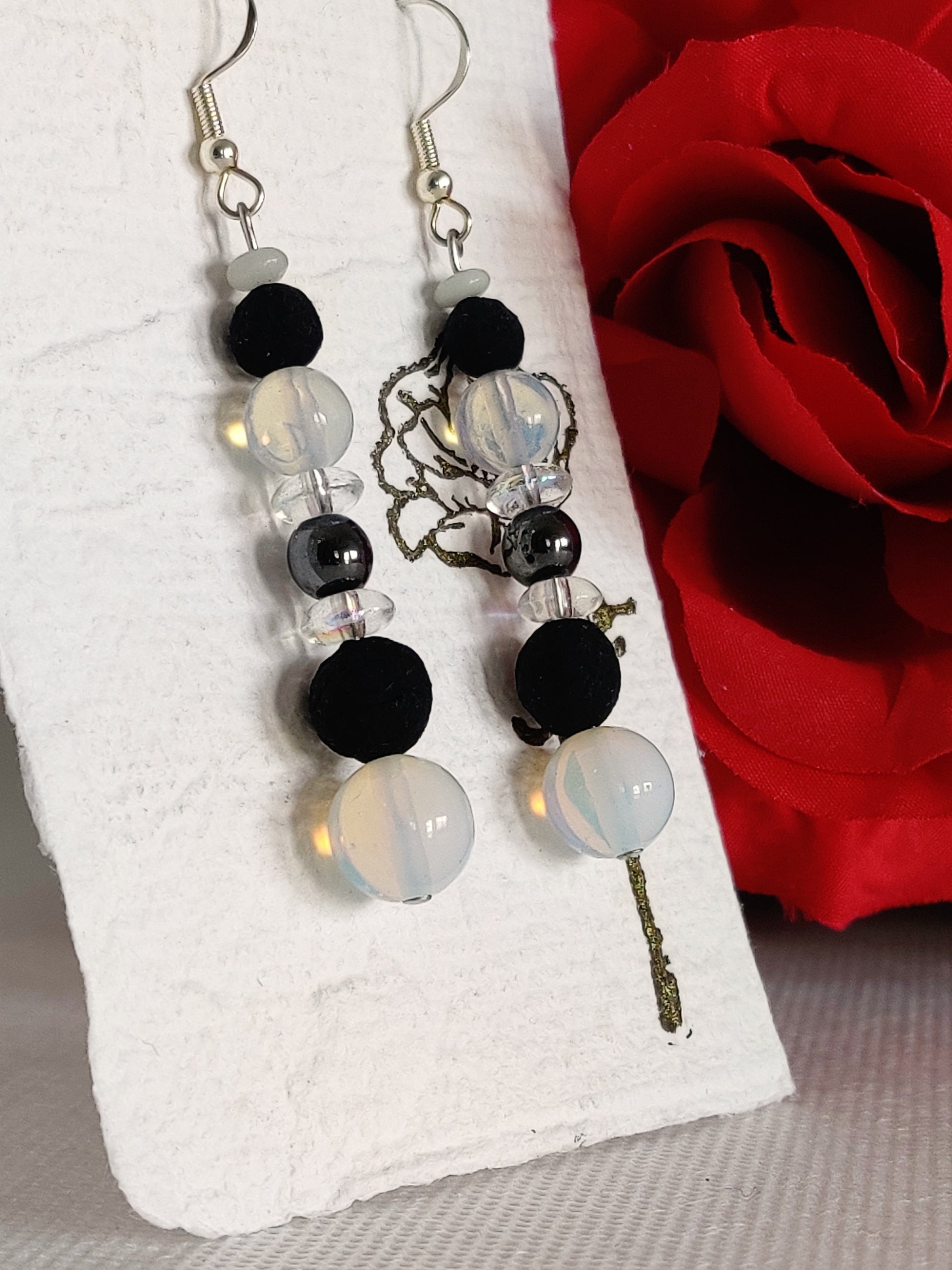 Moonstone beads, black rose beads. Black glass, clear aurora borealis glass, and white stone spacer beads.