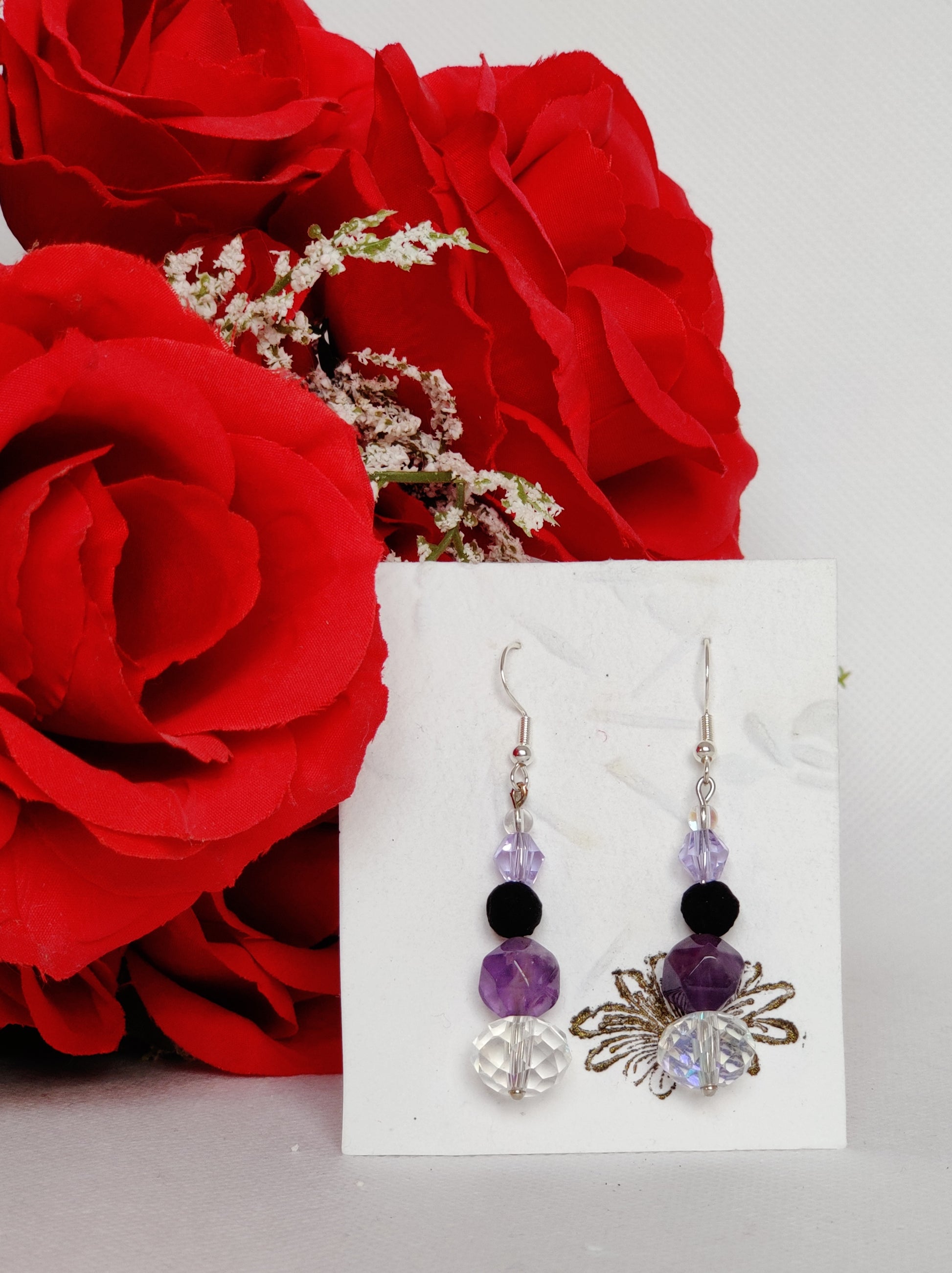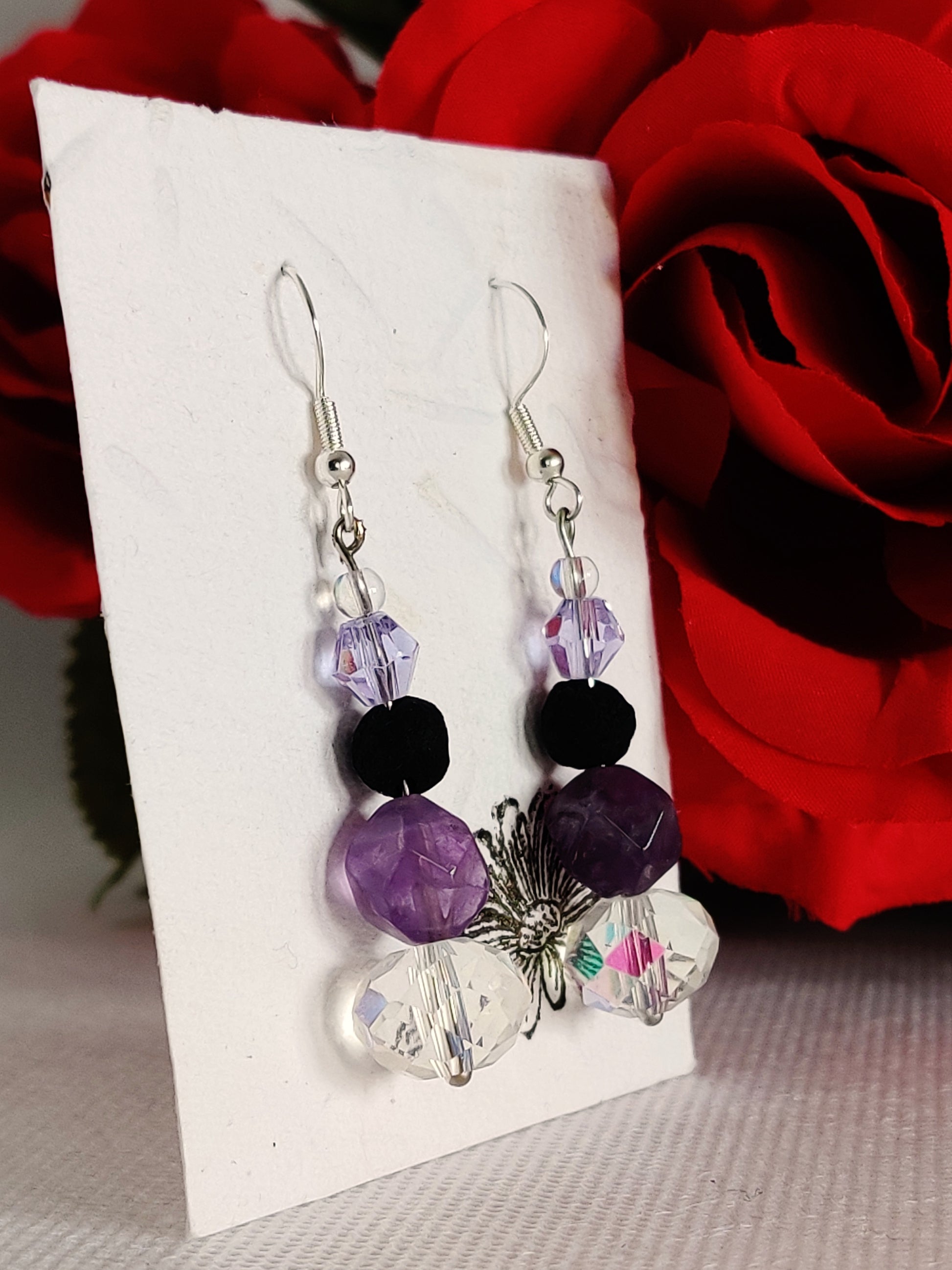 Clear aurora borealis glass beads, amethyst stone beads, lavender glass beads, clear round beads, black rose beads.