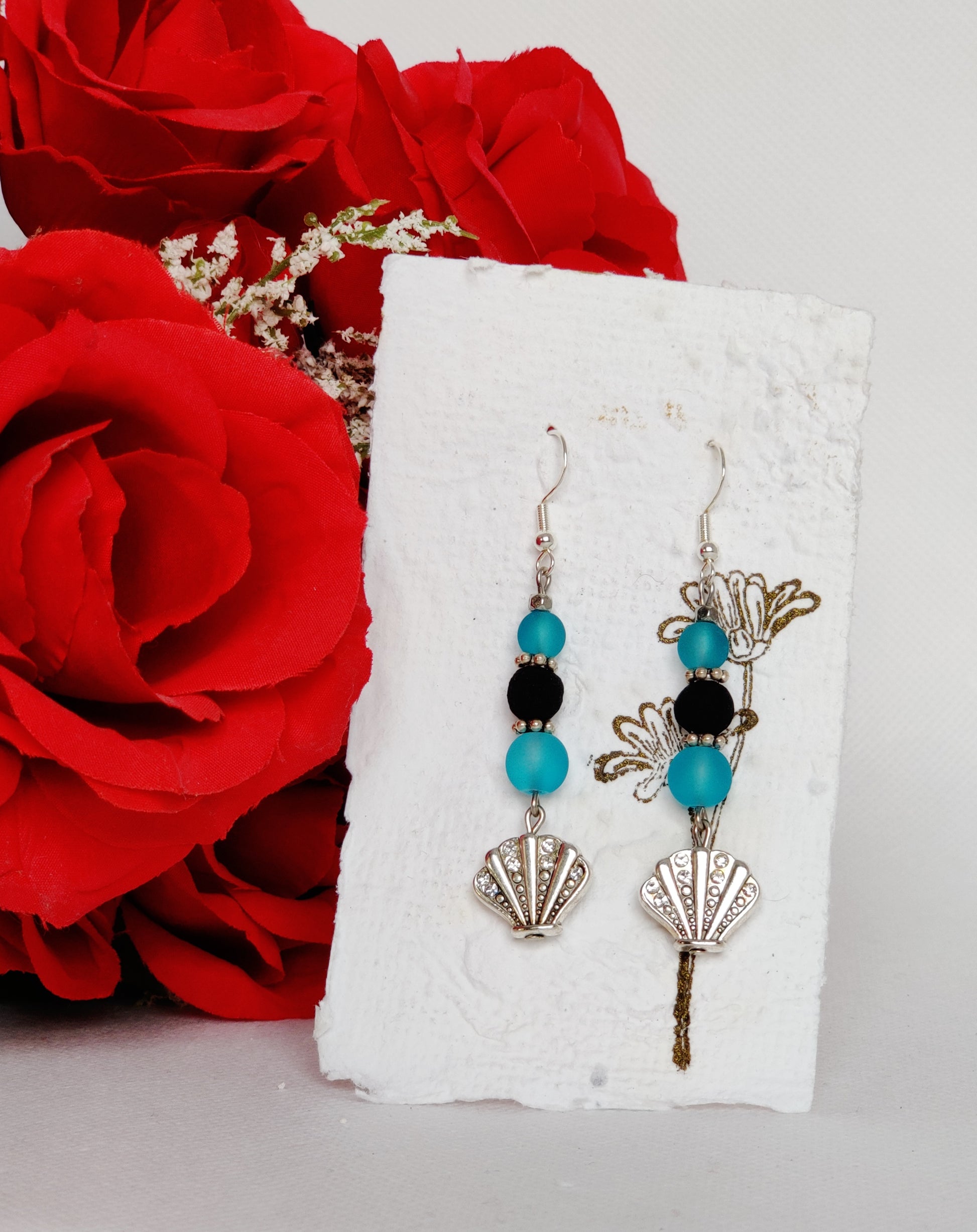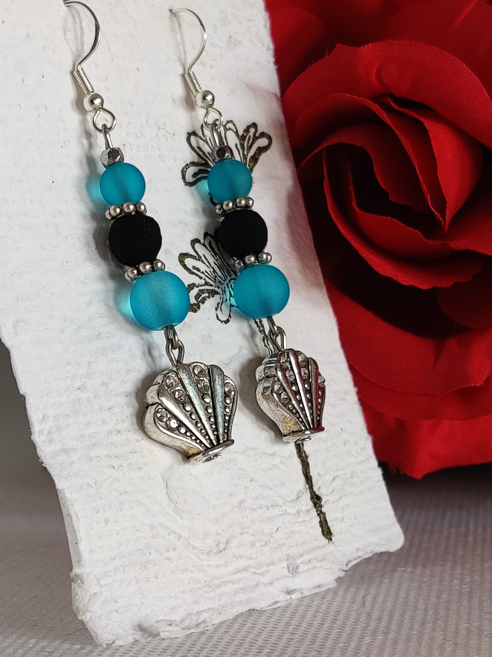 Silver and rhinestone metal shell beads, frosted blue glass beads, silver spacers, black rose beads.