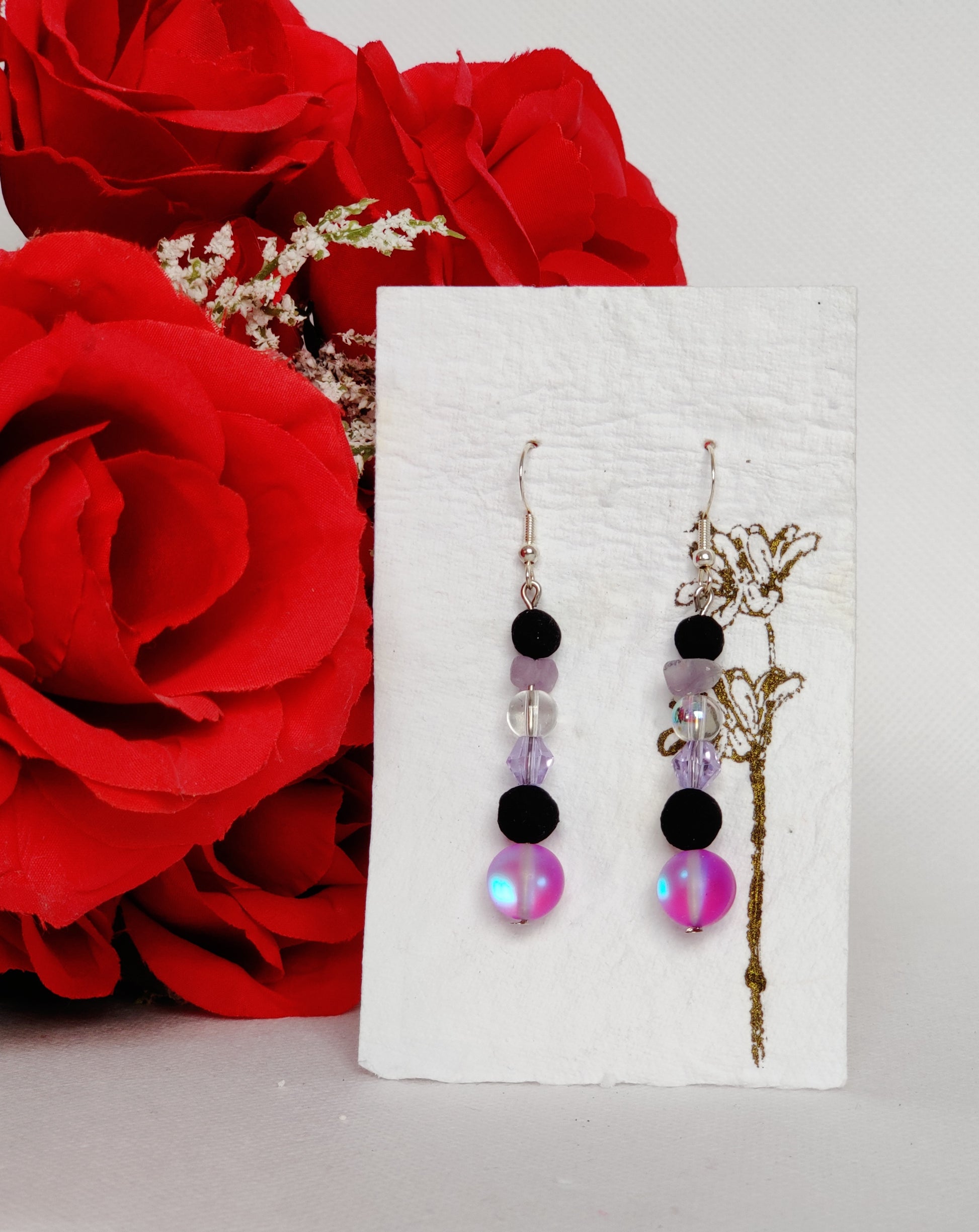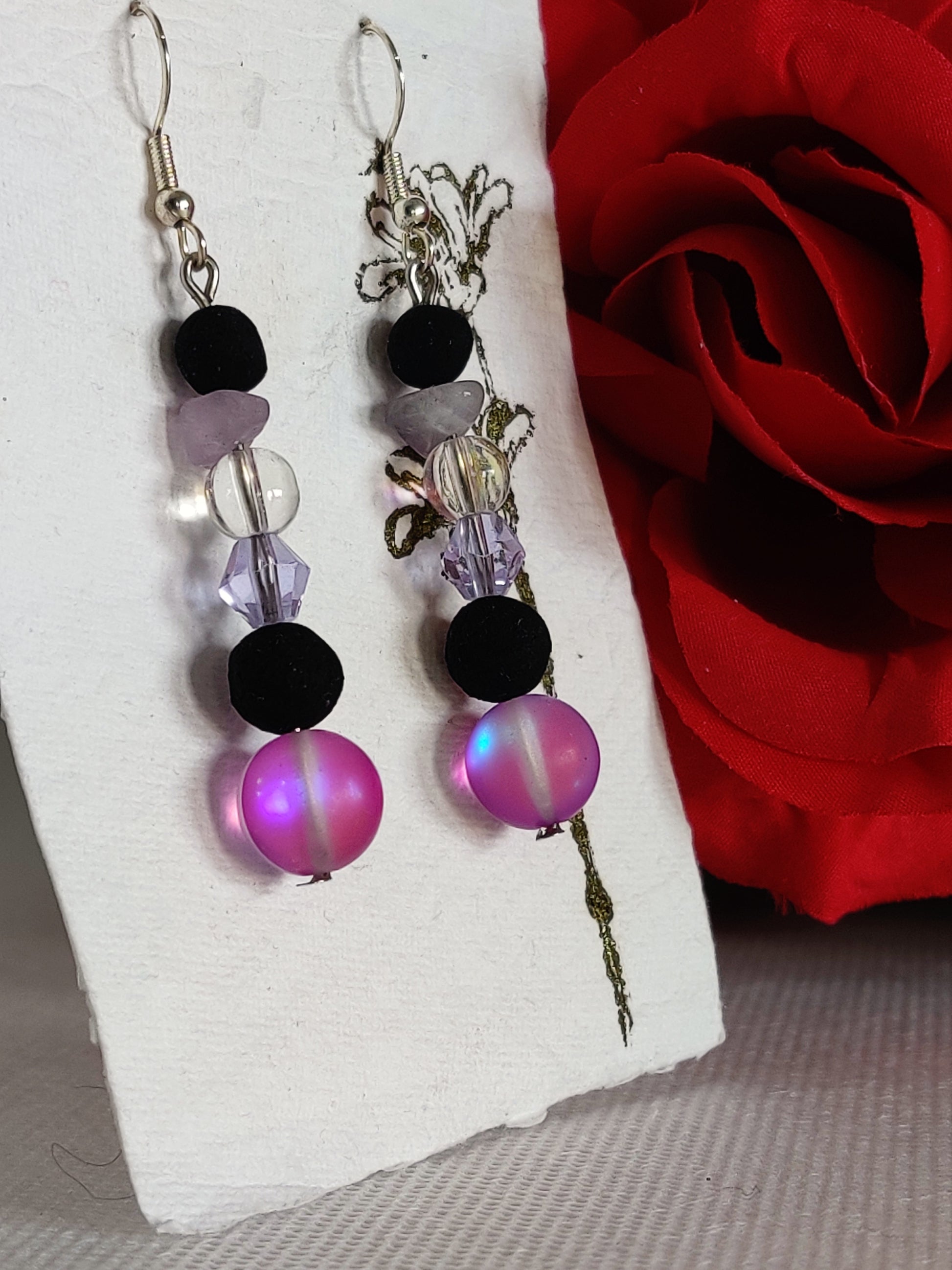 Purple/pink "opal" glass beads, lavender glass beads, aurora borealis round glass beads, amethyst chip beads, black rose beads.