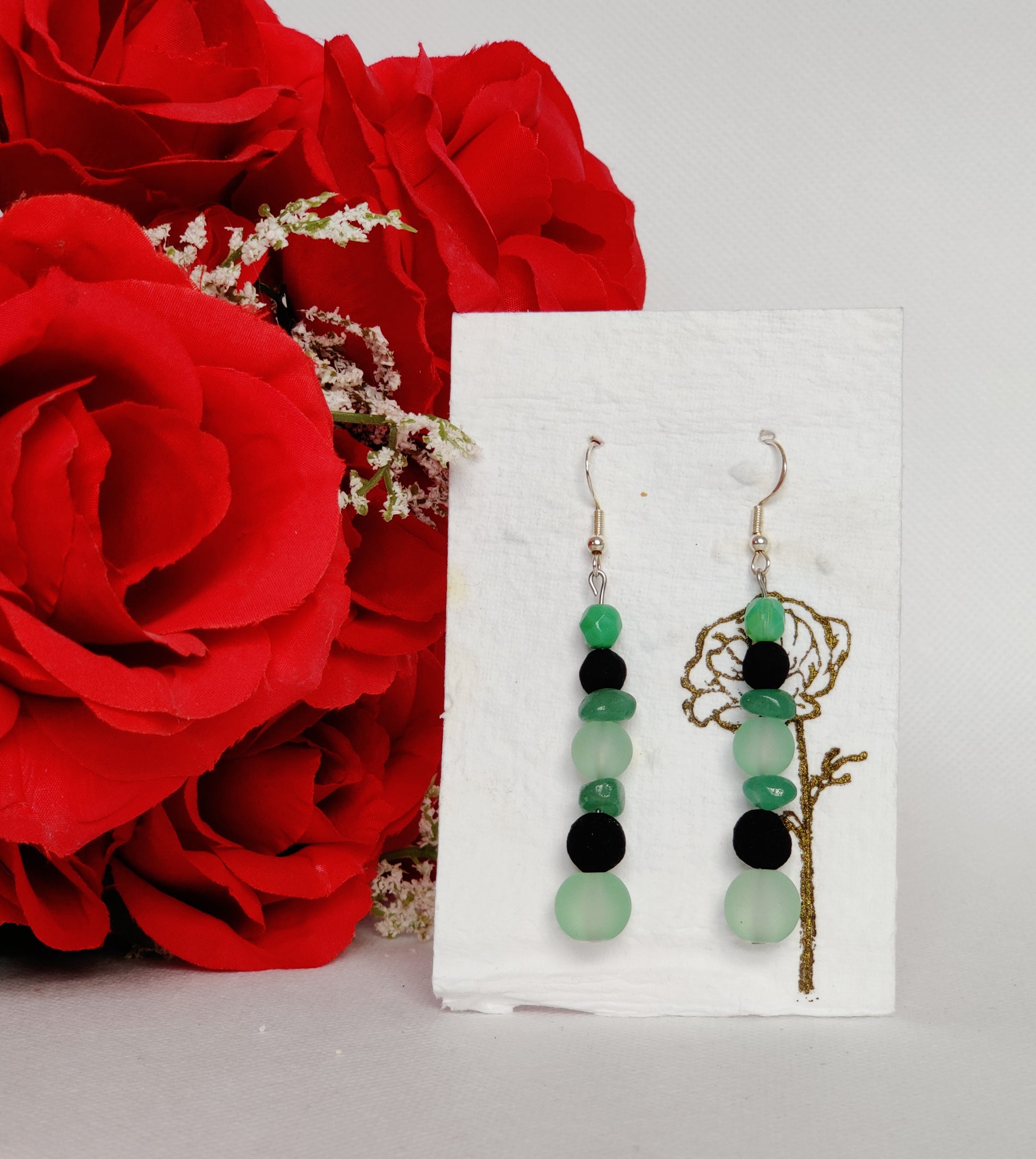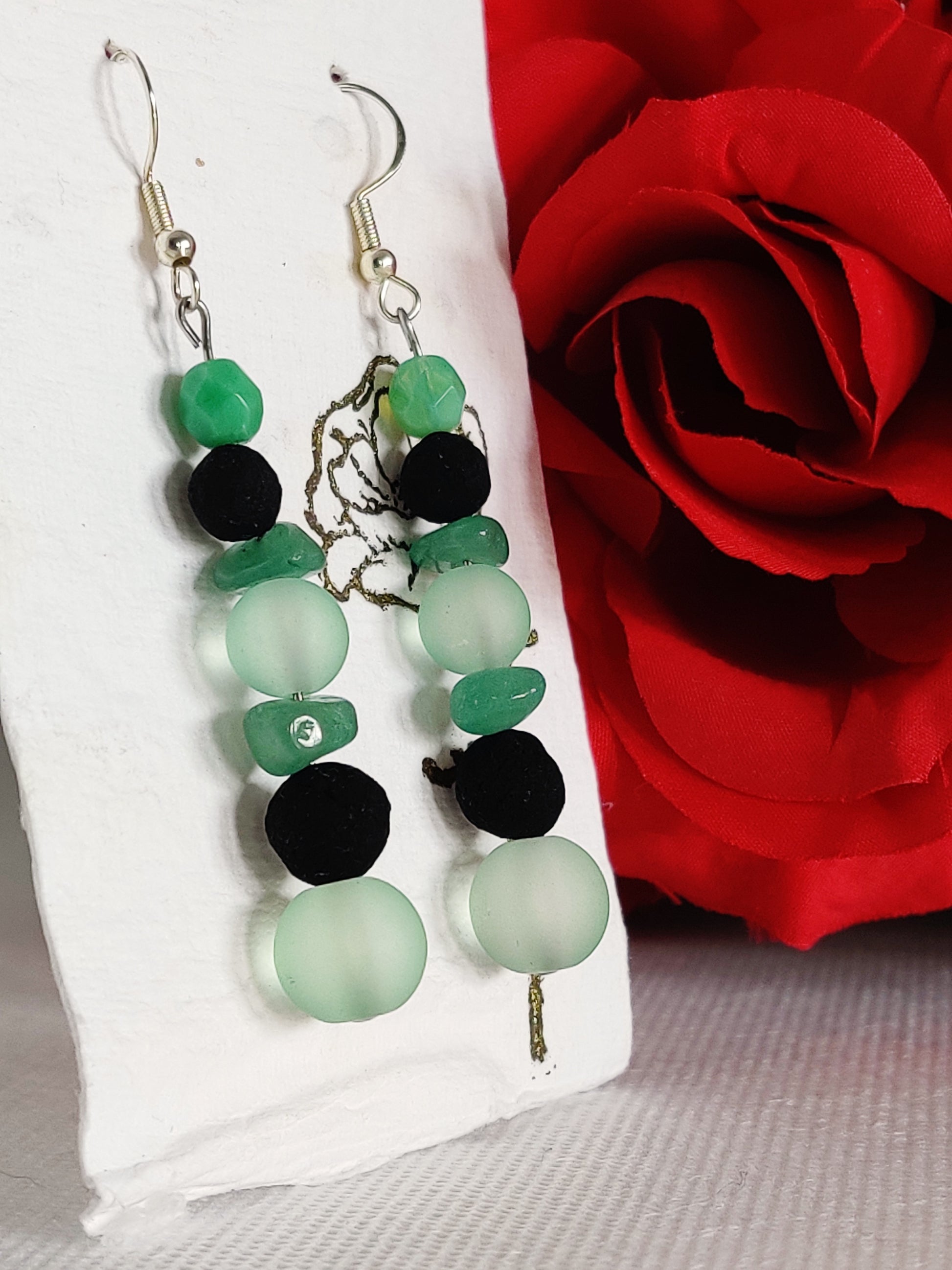 Sea green frosted glass beads, jade chip beads, green opaque glass beads, black rose beads.