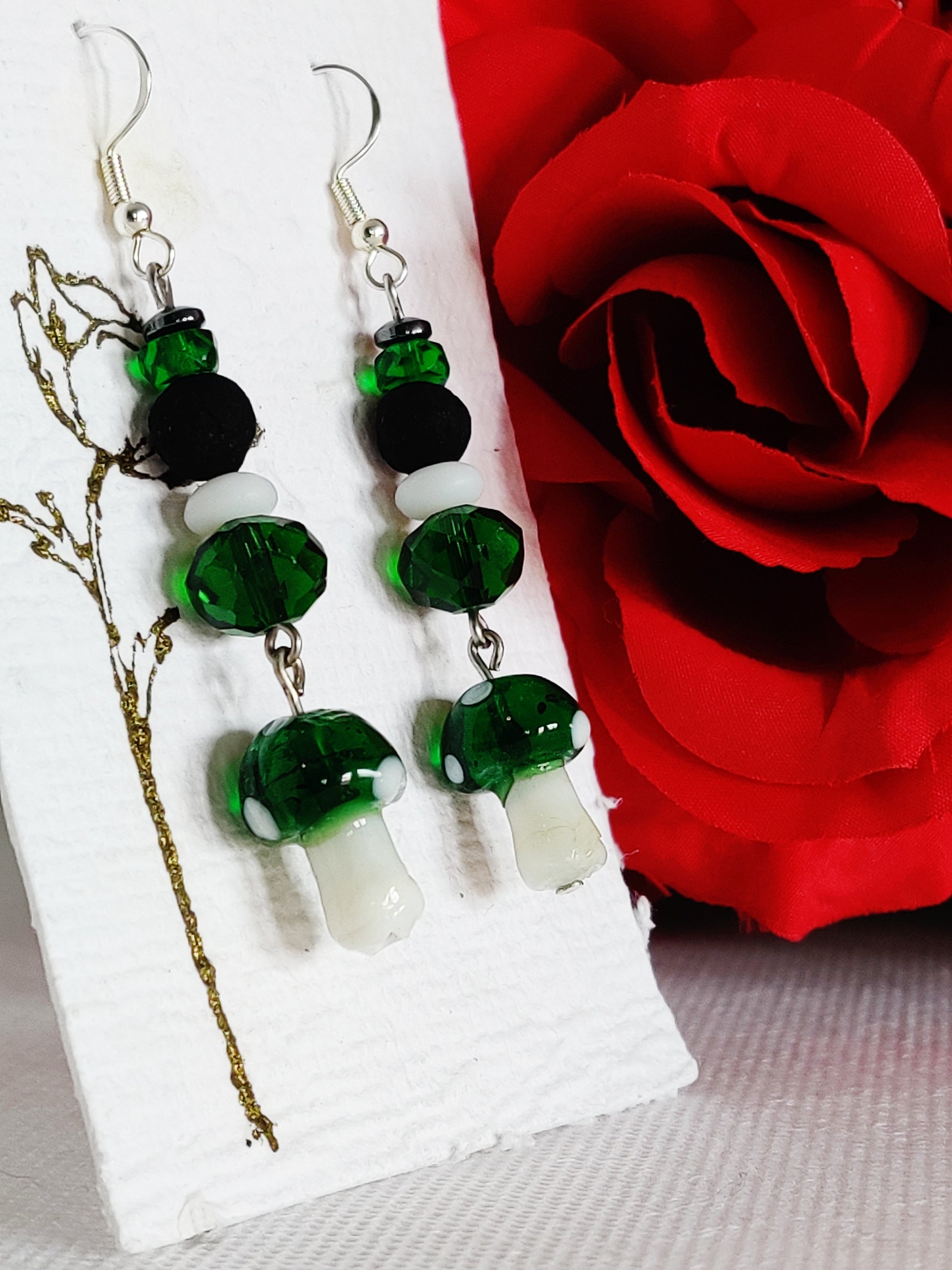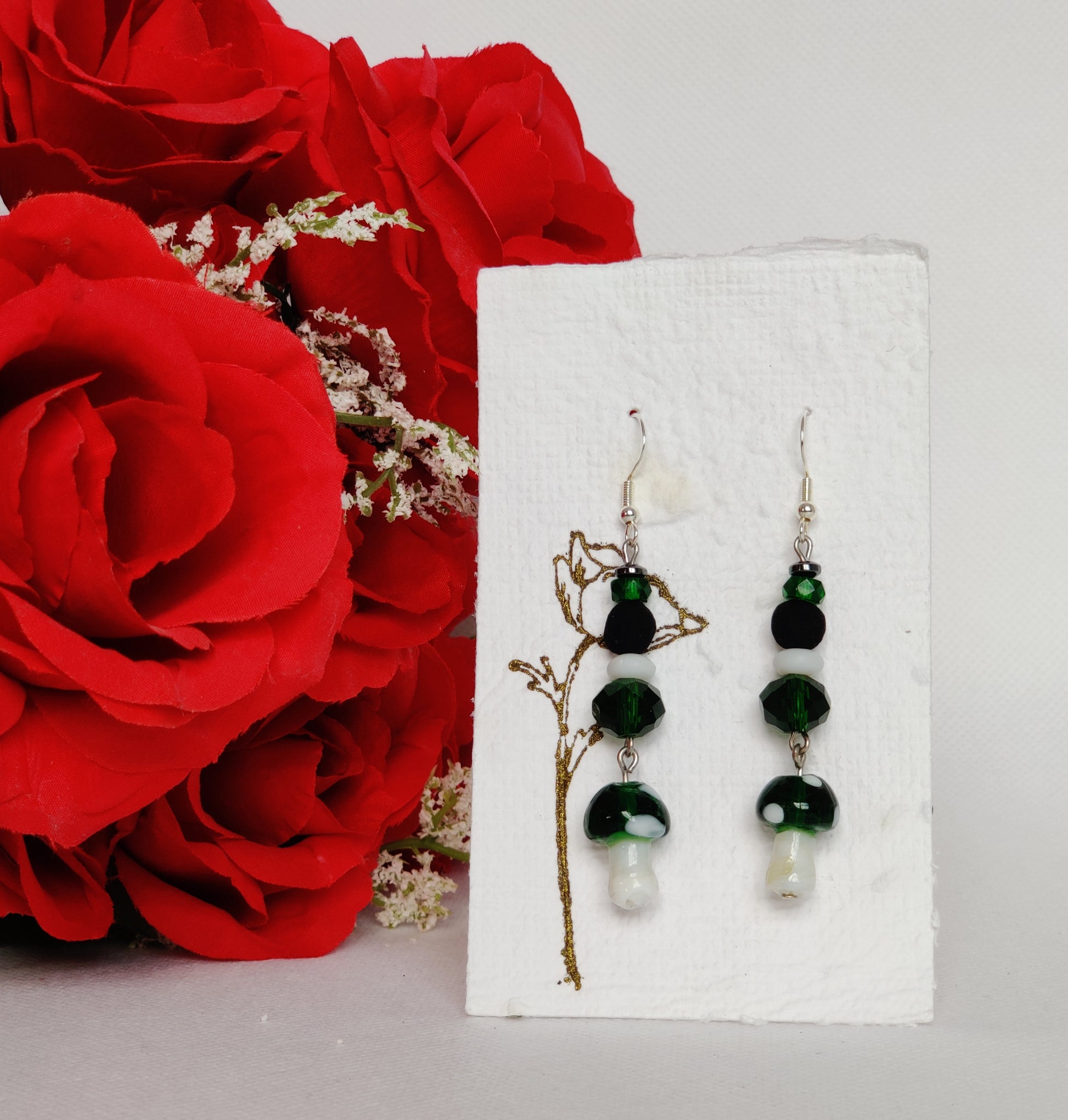 Green and white glass mushroom beads, faceted dark green glass beads, white glass spacers, hematite spacers, black rose beads