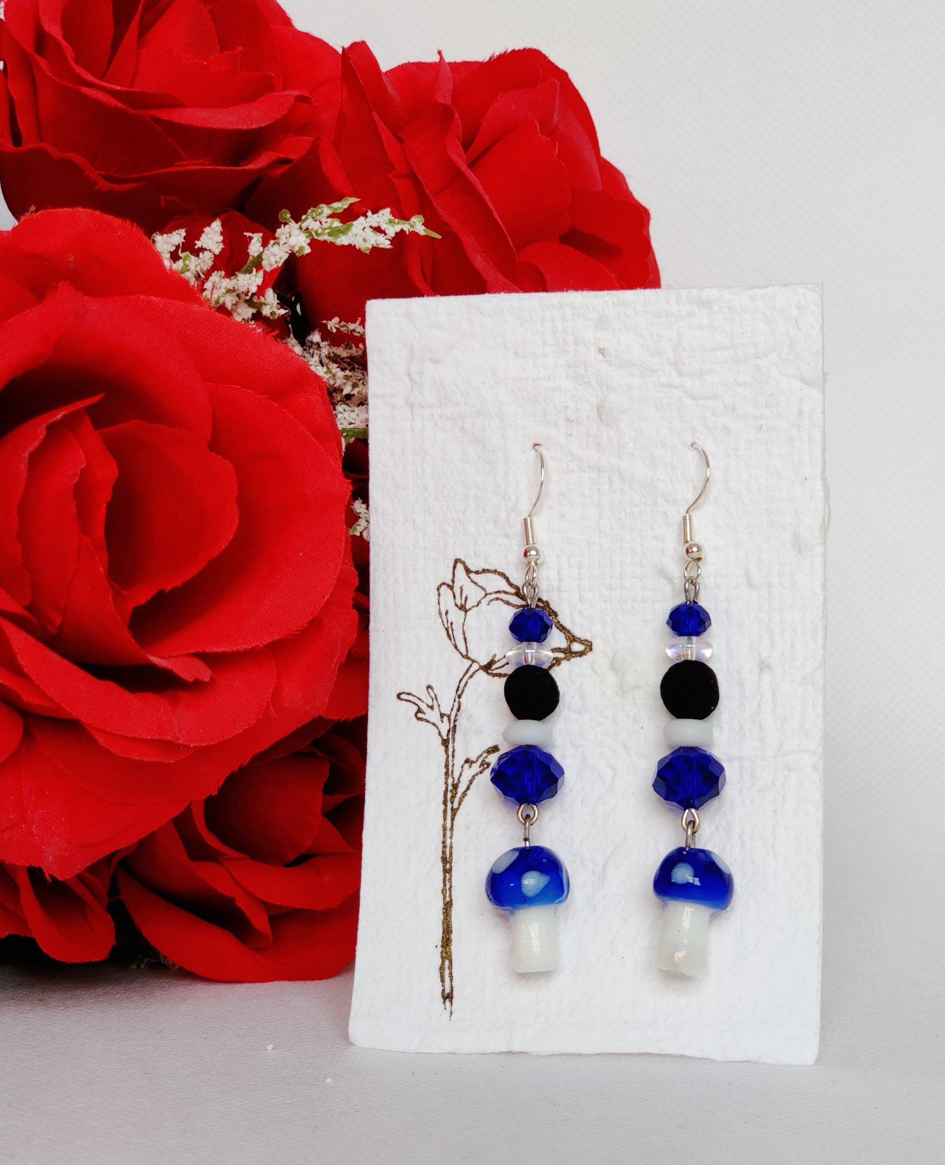 Dark blue and white glass mushrooms, dark blue faceted glass, smooth white stone spacers, clear aurora borealis glass spacers, black rose beads.