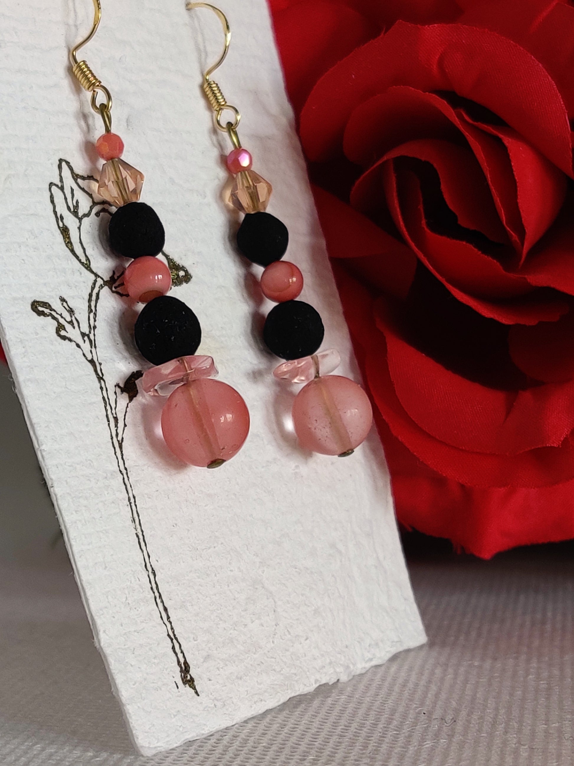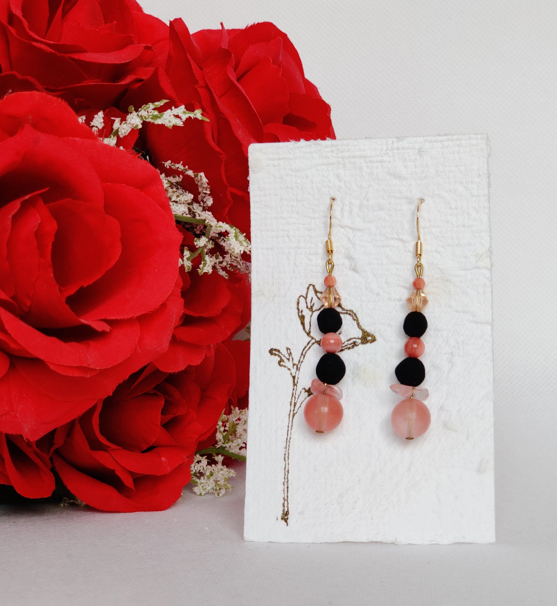 Cherry quartz beads, pink shell beads, faceted pink glass beads, black rose beads. Earring hooks are sterling silver with an 18k gold coating.