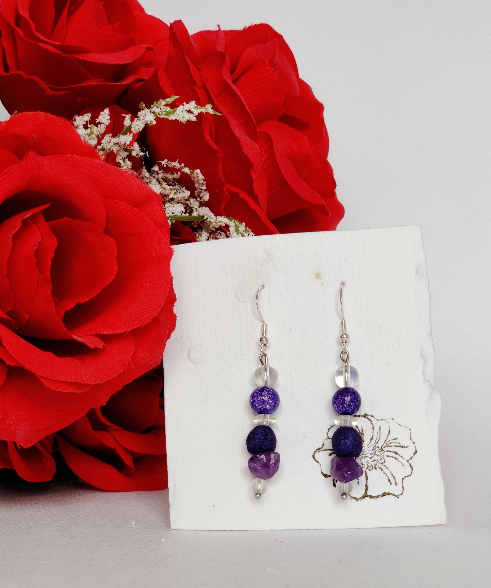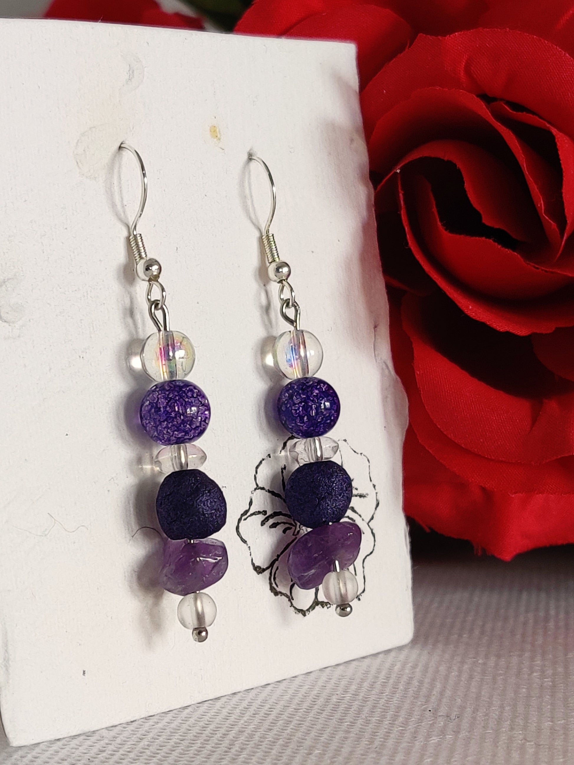 Clear frosted glass beads, amethyst beads, clear aurora borealis glass spacers, purple crackle glass beads, clear glass beads, purple shimmer rose beads.