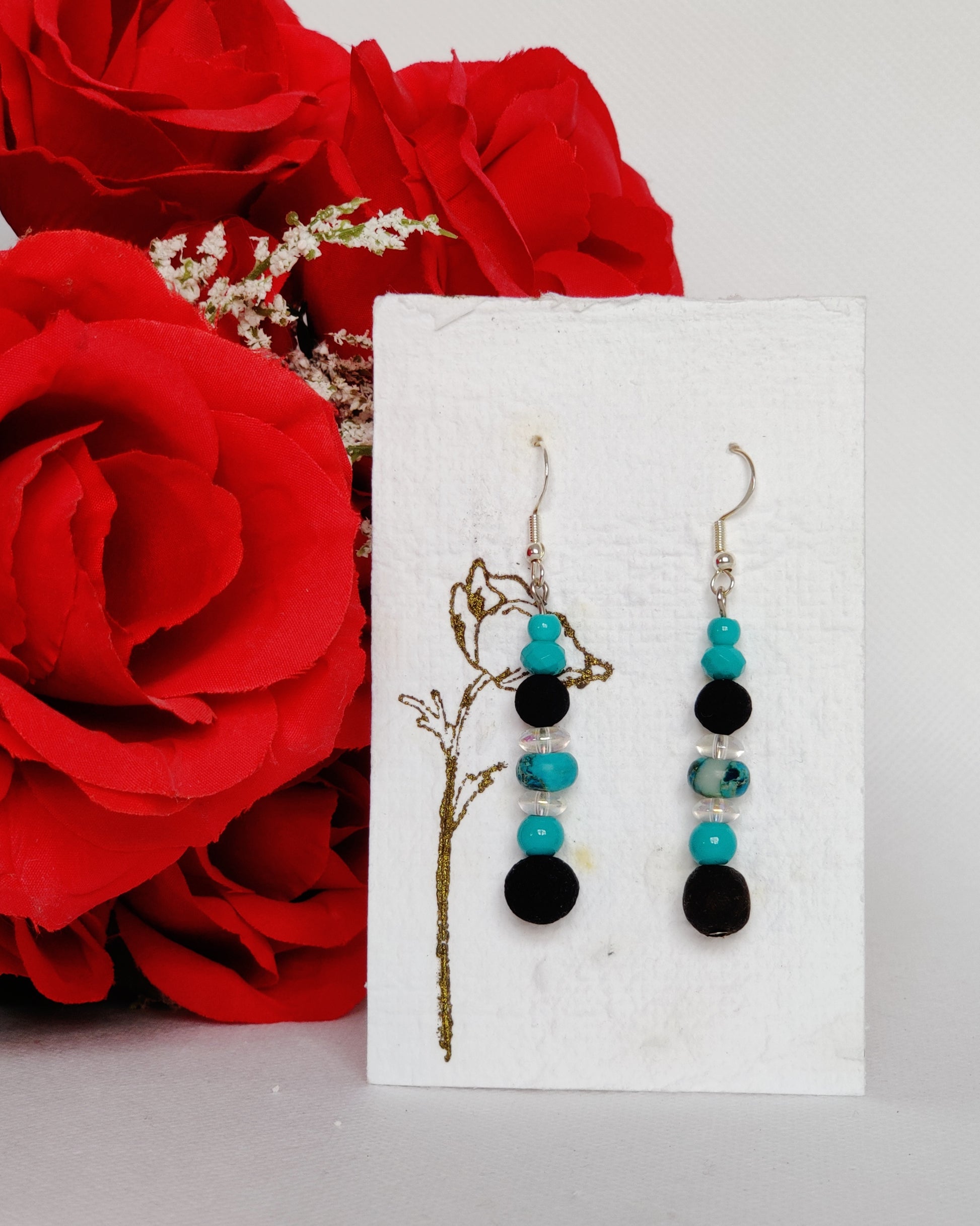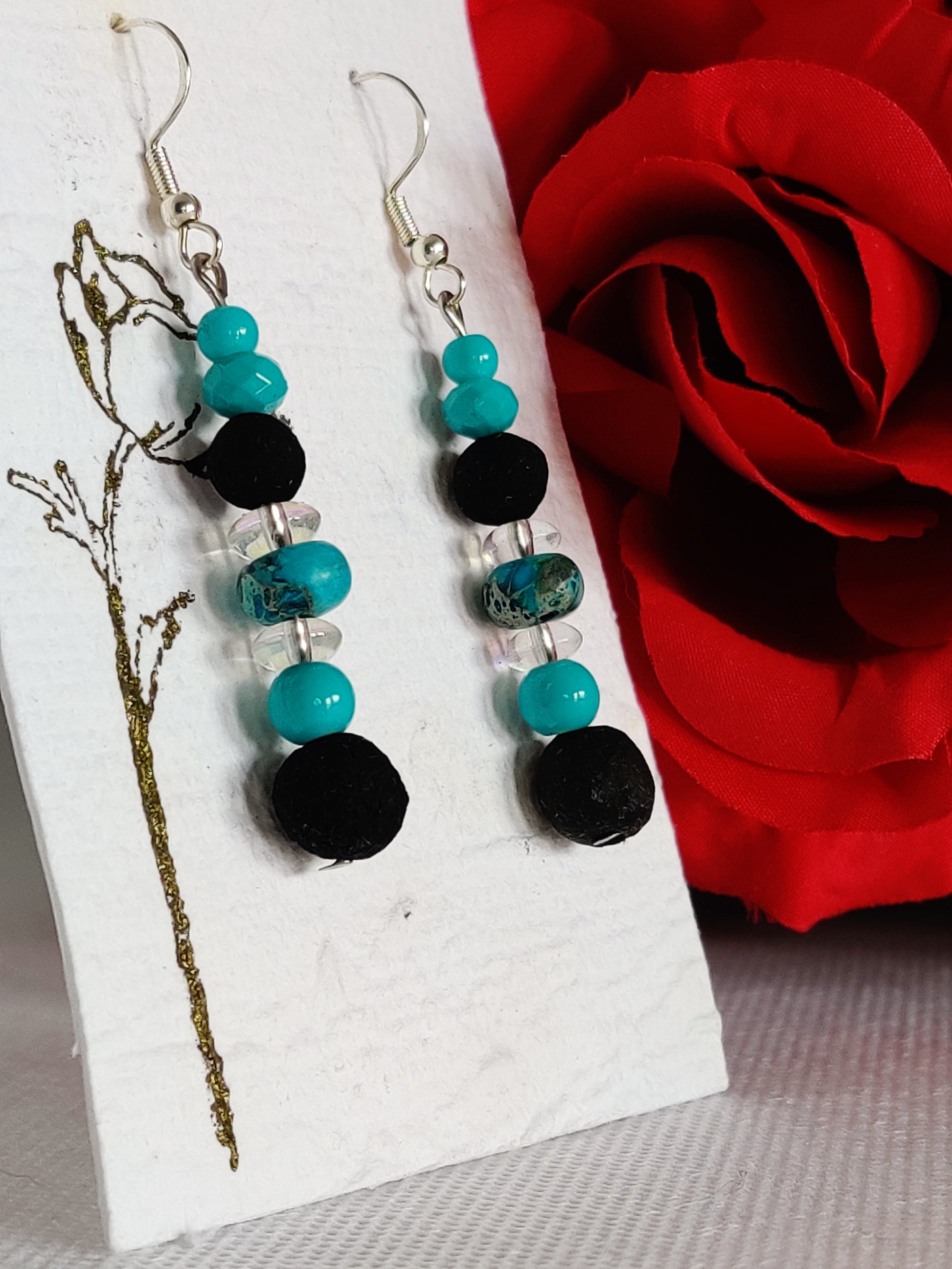 Turquoise glass beads, dyed turquoise stone beads, clear aurora borealis glass spacers, black rose beads.