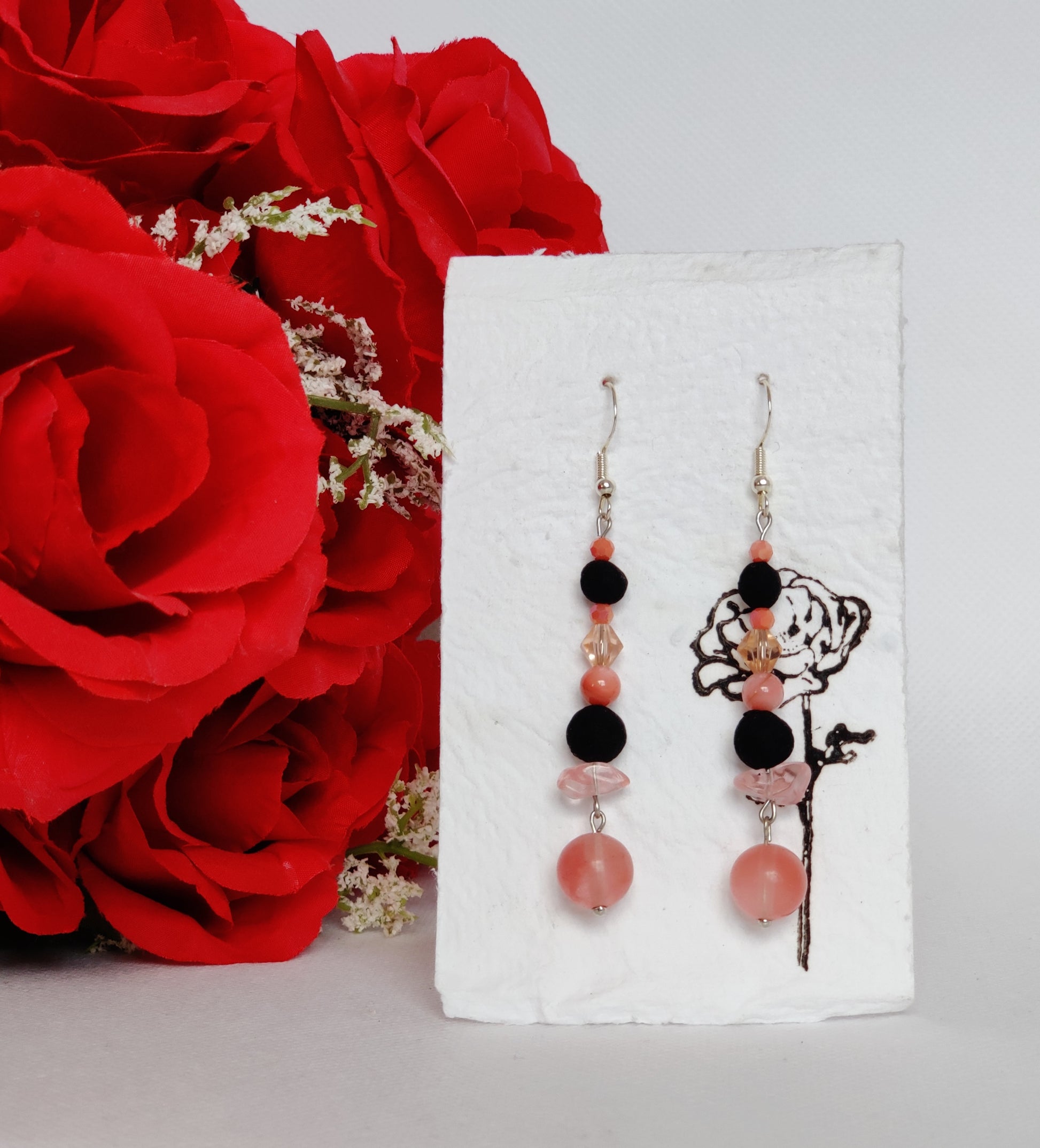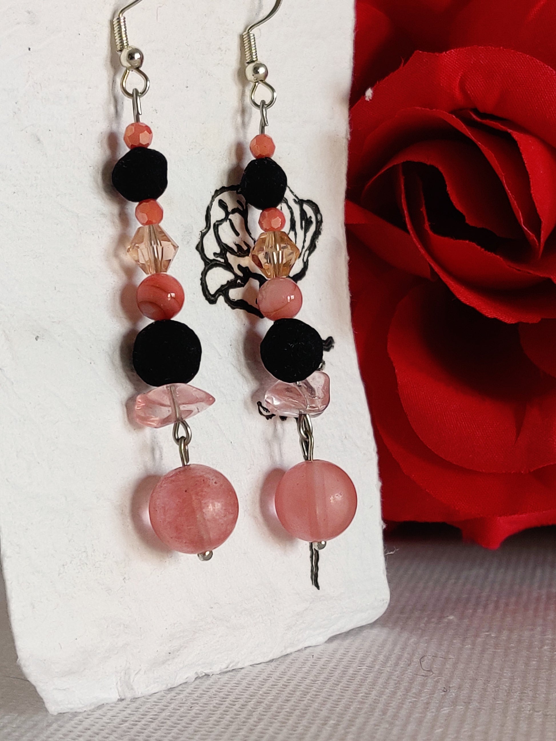 Cherry quartz beads, pink shell beads, pink aurora borealis faceted glass beads, black rose beads.