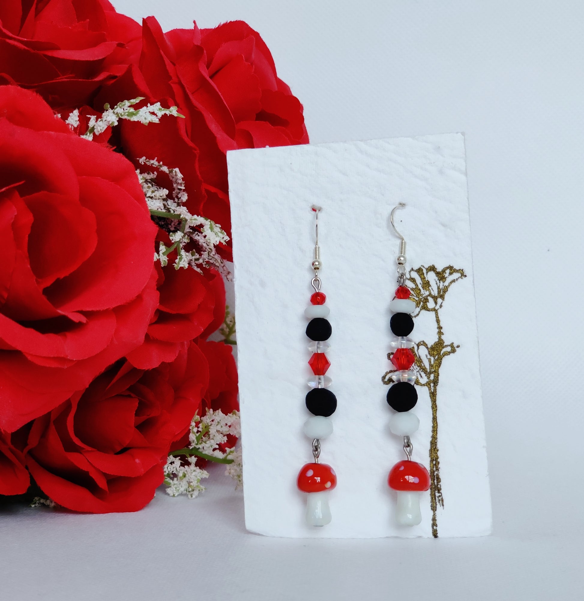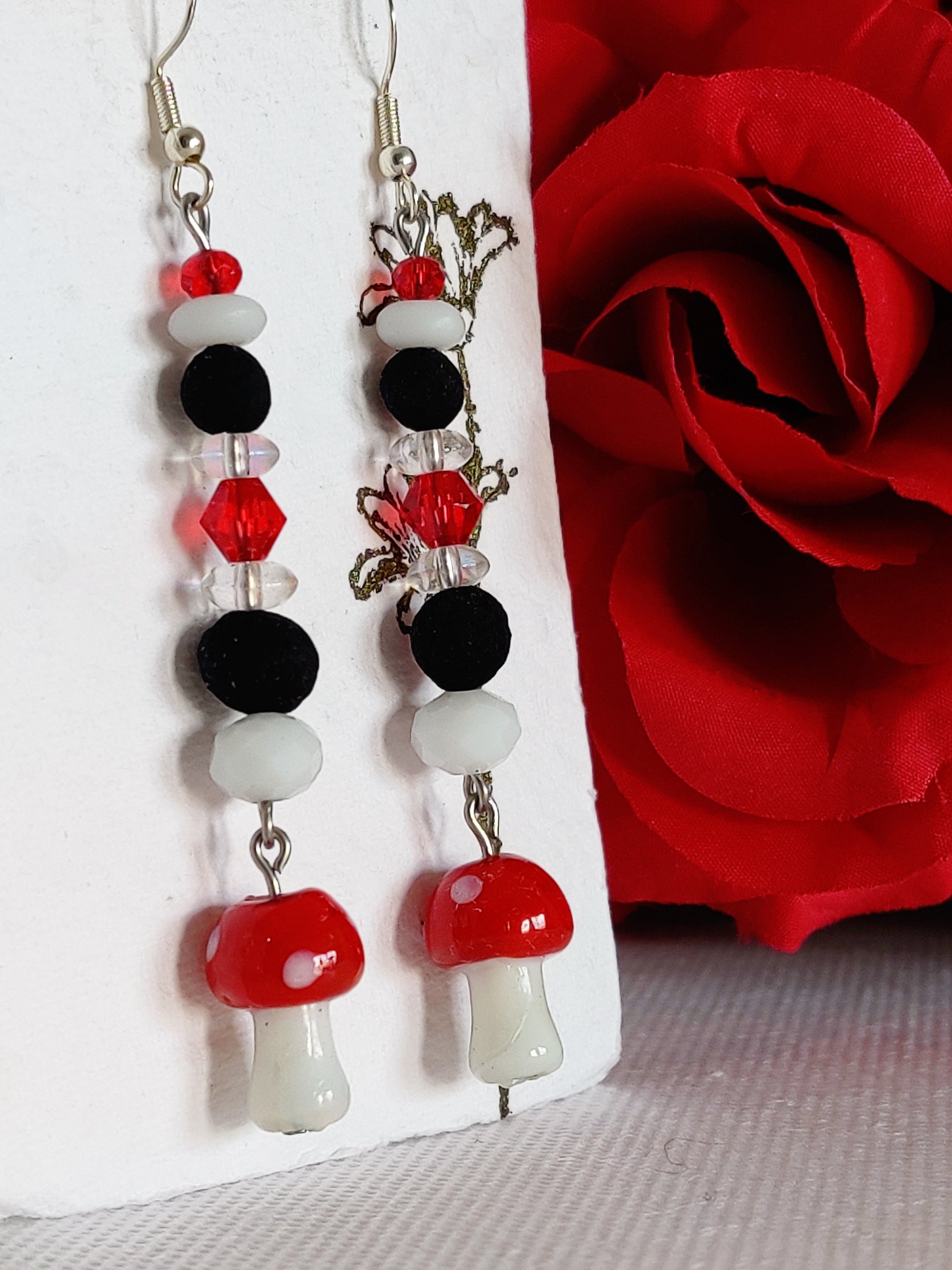Red and white glass mushroom beads, white glass beads, red glass beads, clear aurora borealis glass bead spacers, black rose beads.