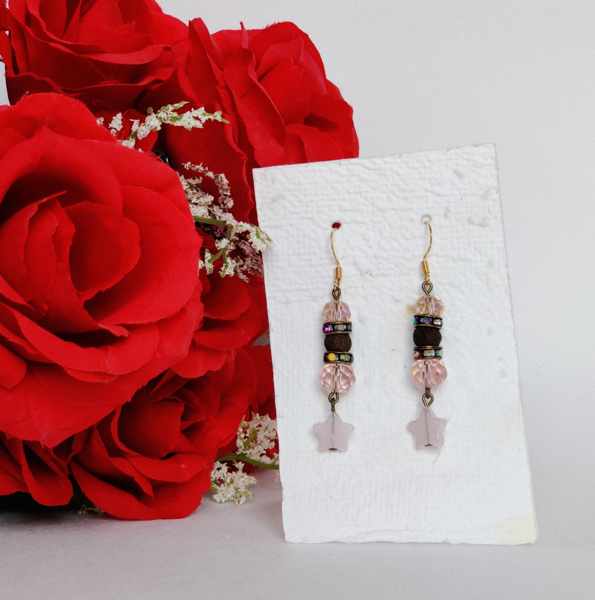 Glass beads, aurora borealis rhinestone spacers, black rose beads. Earring hooks are sterling silver and coated in 18k gold.