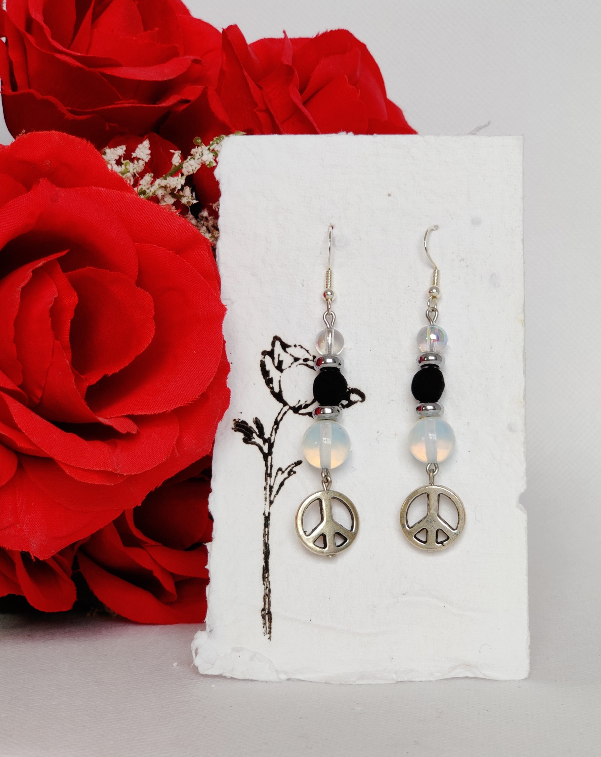 Metal peace signs, moonstone beads, silver glass spacers, clear glass beads, black rose beads.