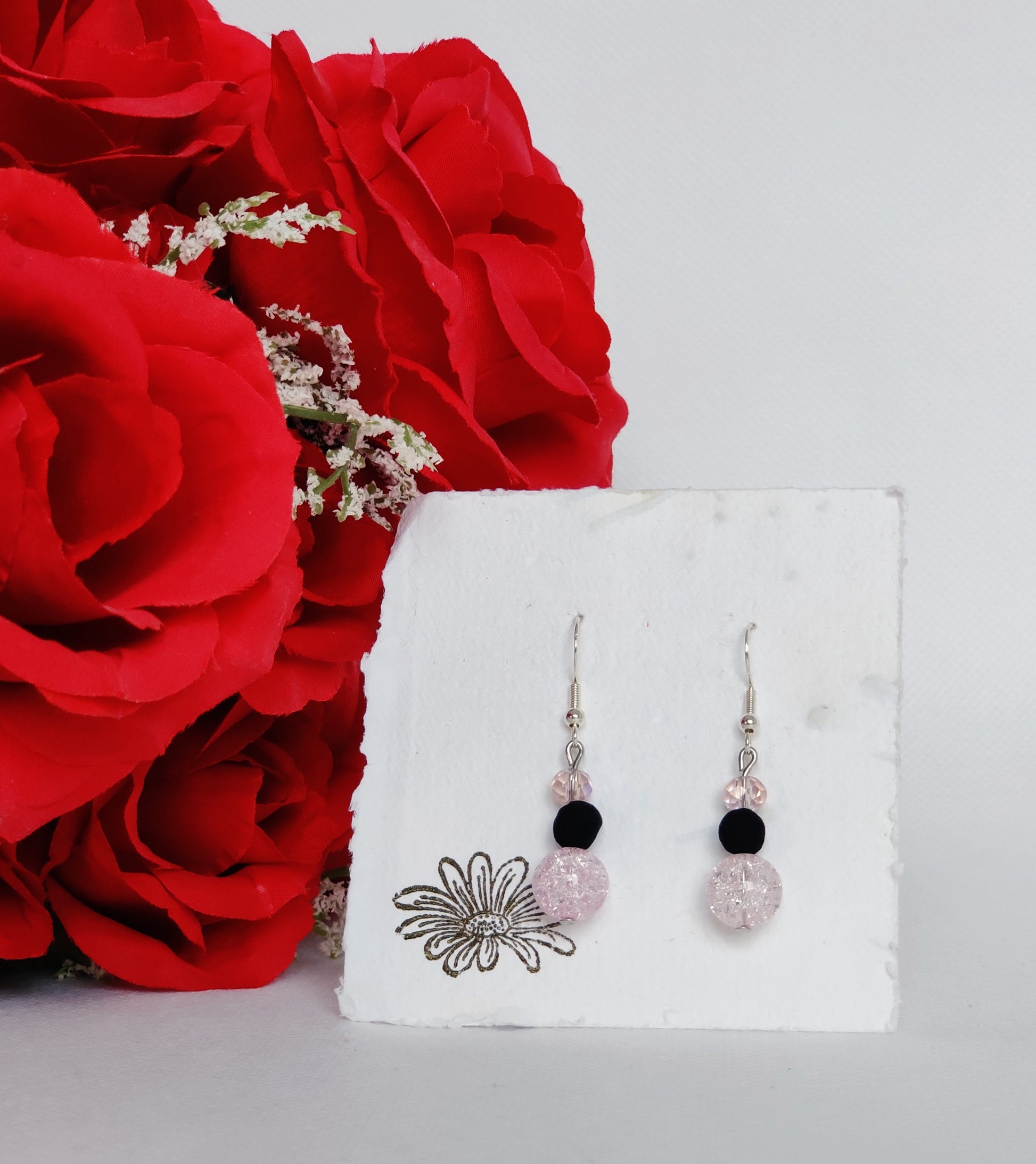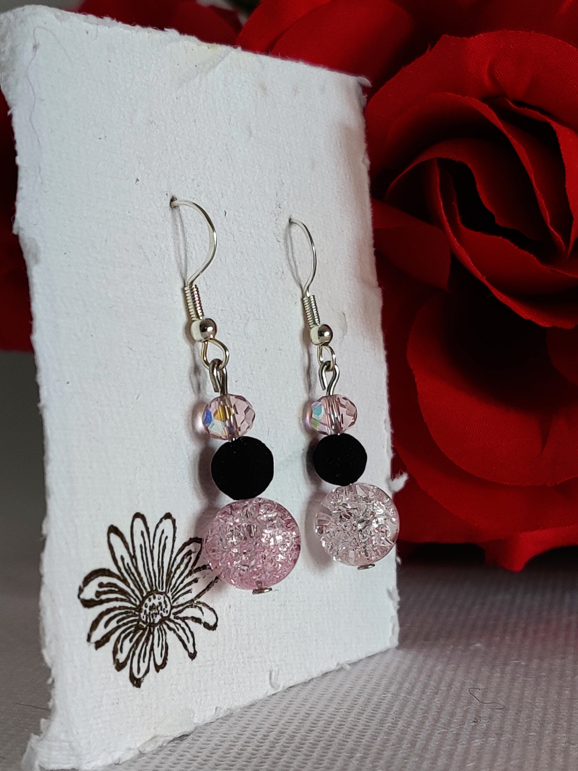 Baby pink cracked glass beads, pink faceted beads, black rose beads.