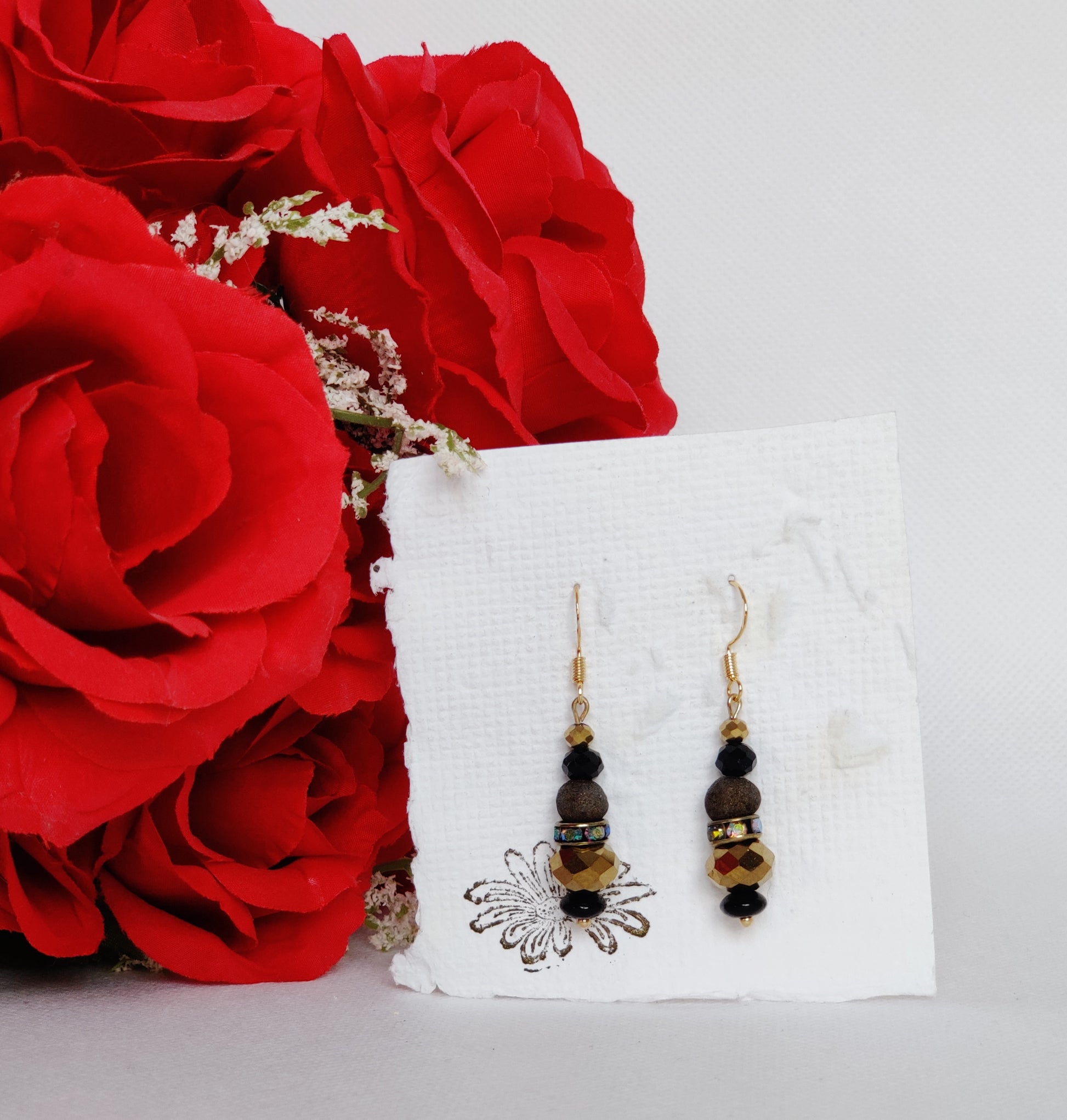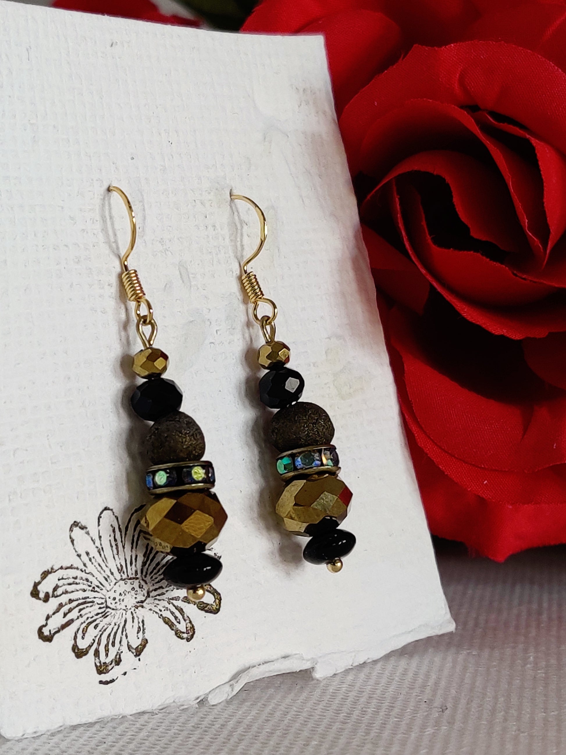 Black glass spacers, gold faceted glass beads, rhinestone spacers, black faceted glass beads, gold shimmer rose beads.