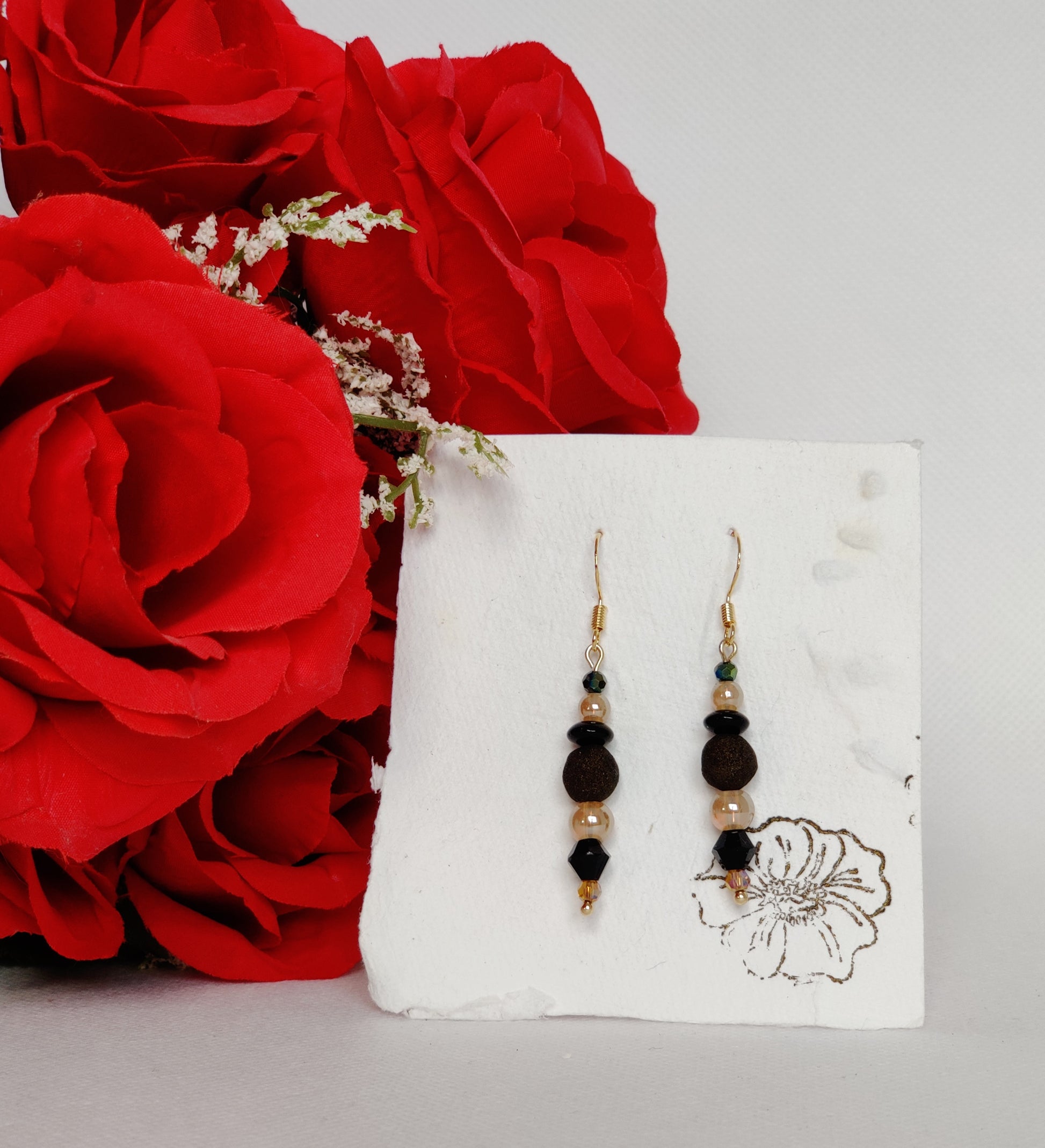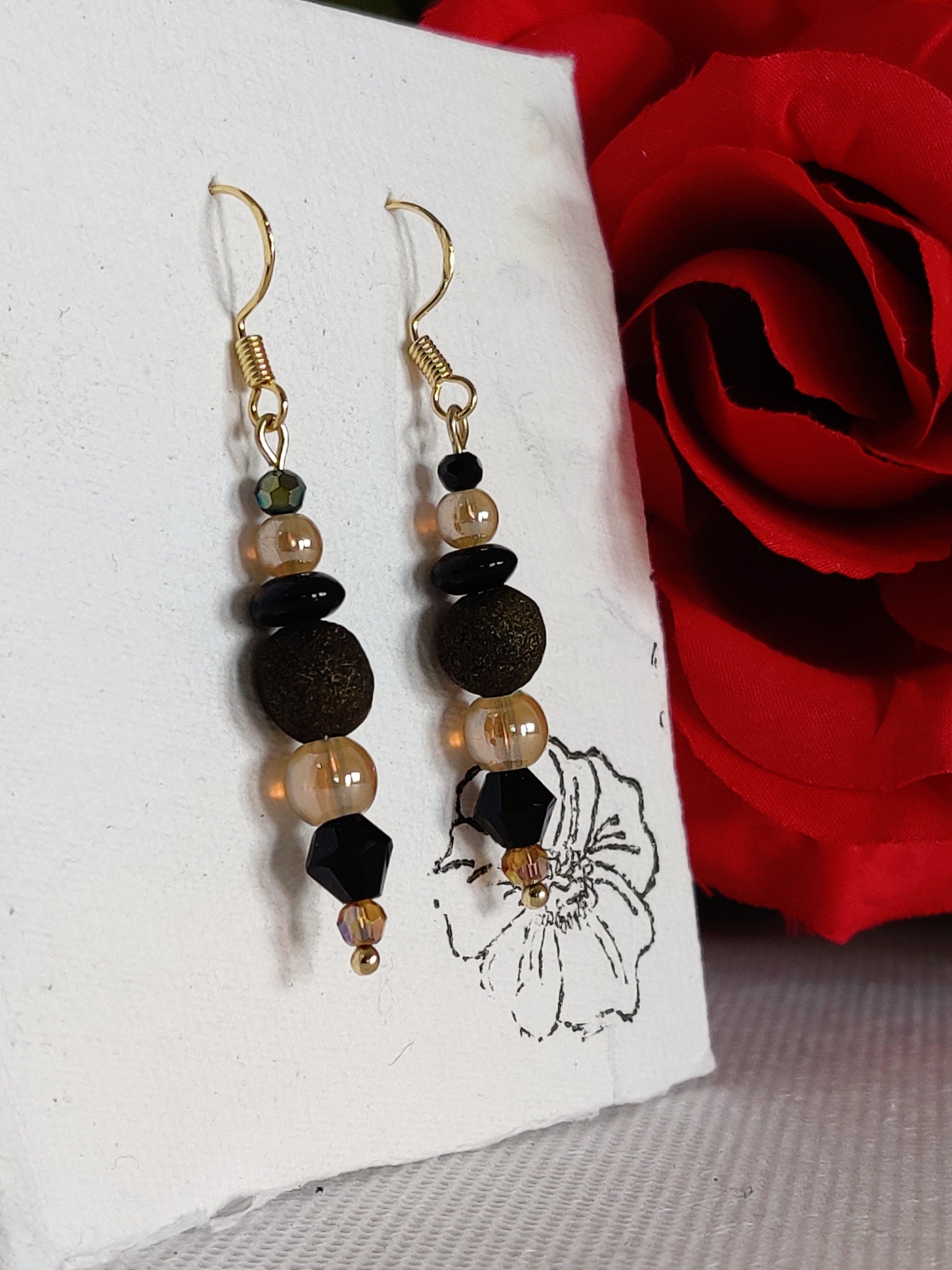 Gold faceted glass beads, black faceted glass beads, gold pearlescent glass beads, black glass spacers, gold shimmer rose beads.
