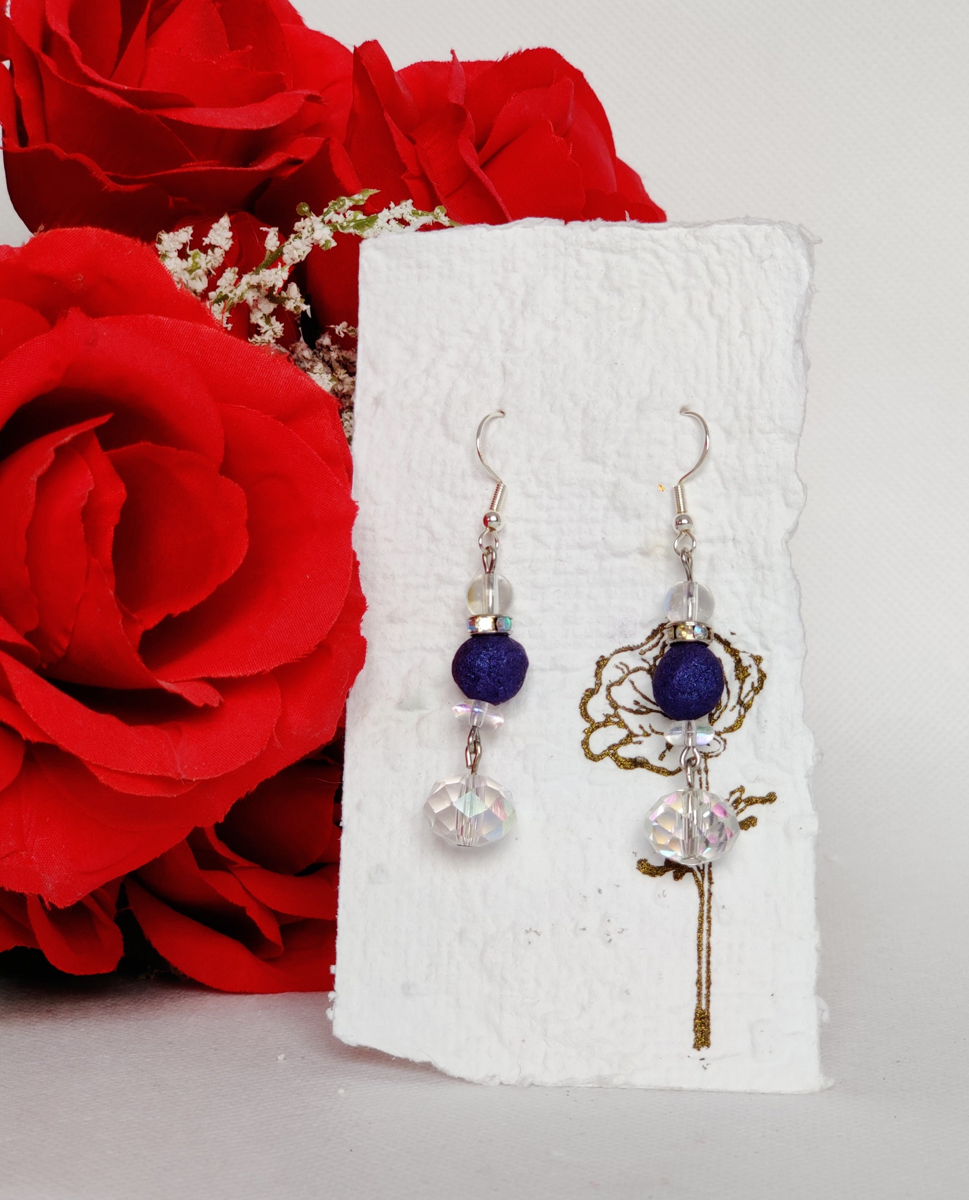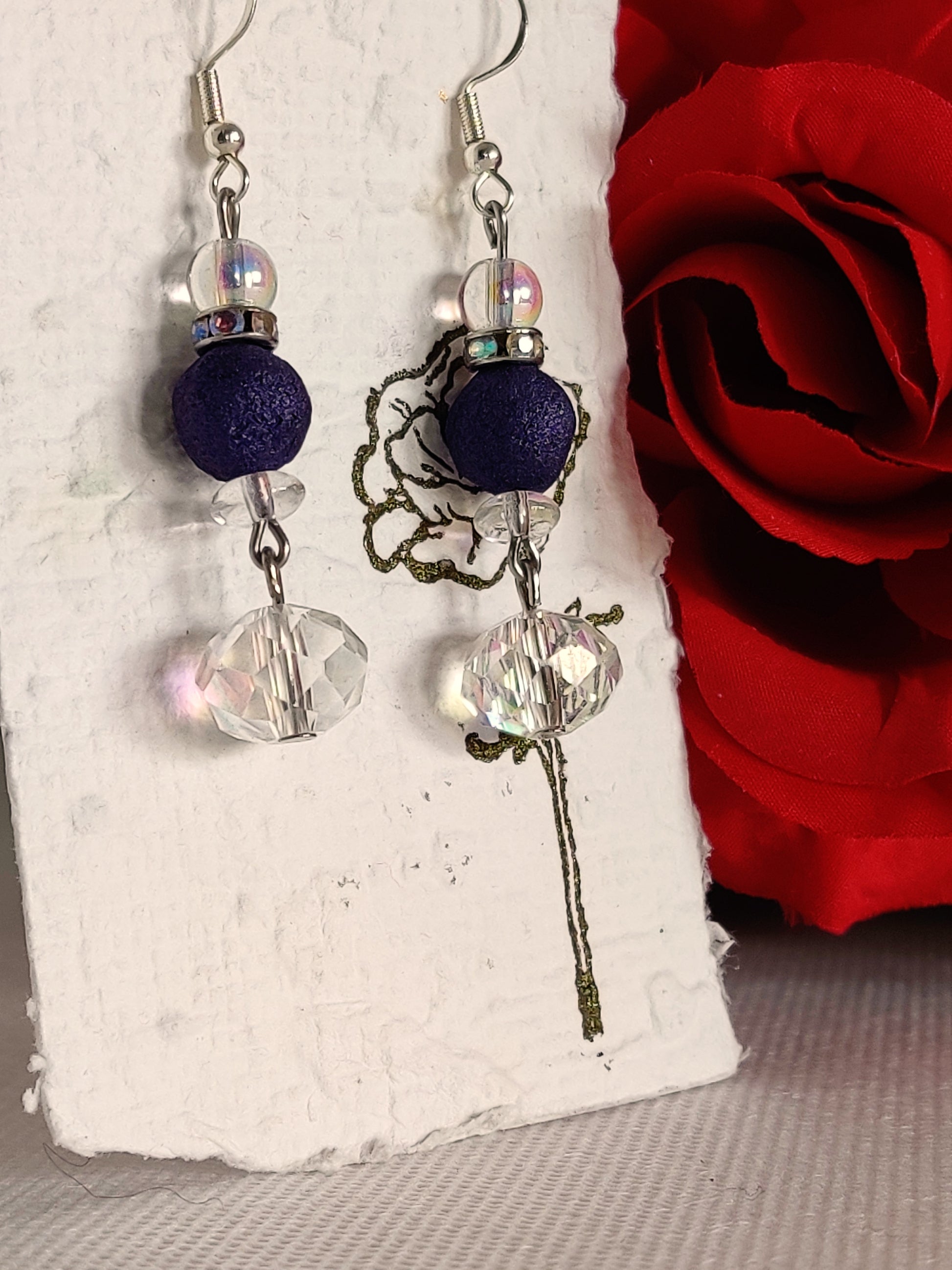 Clear aurora borealis glass beads, rhinestone spacers, and purple shimmer rose beads.
