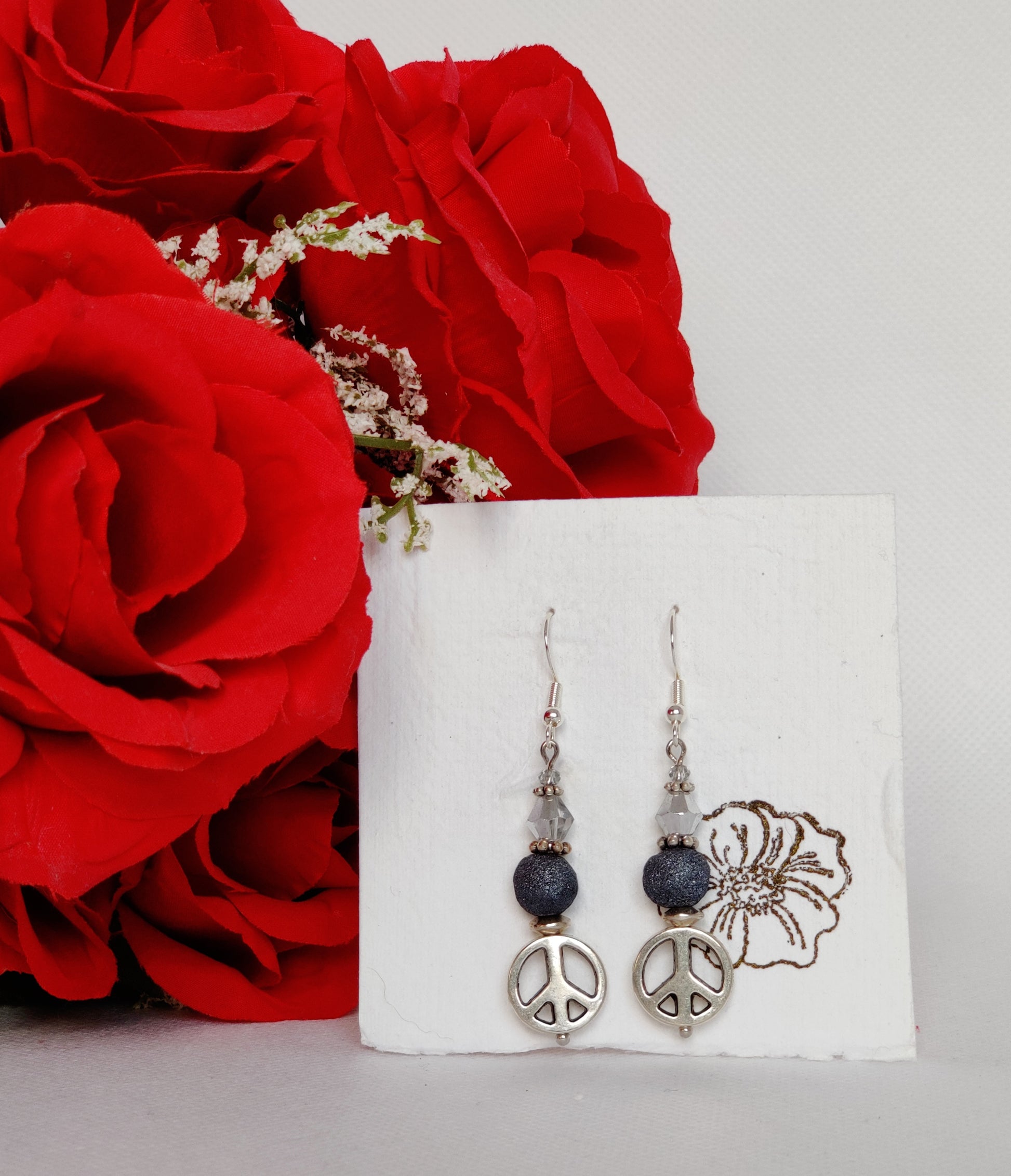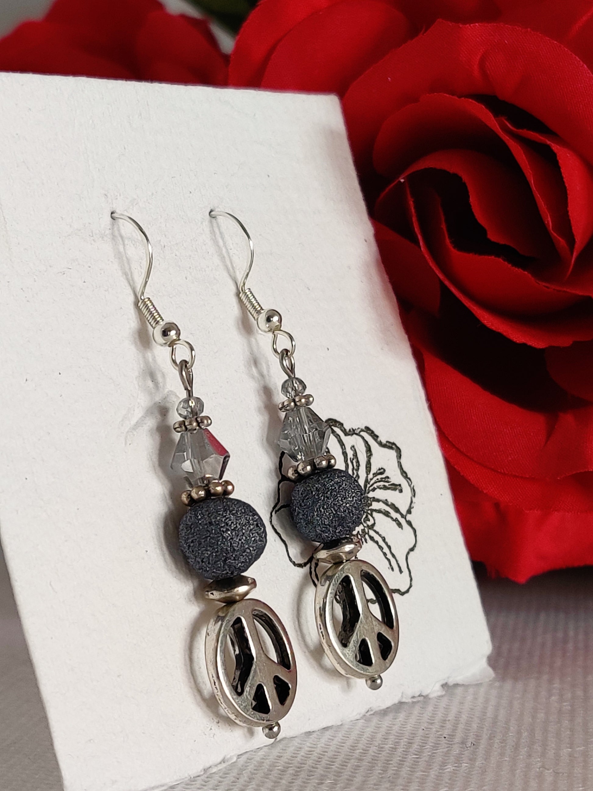 Silver metal peace signs, silver metal spacer beads, silver faceted glass beads, silver shimmer rose beads.