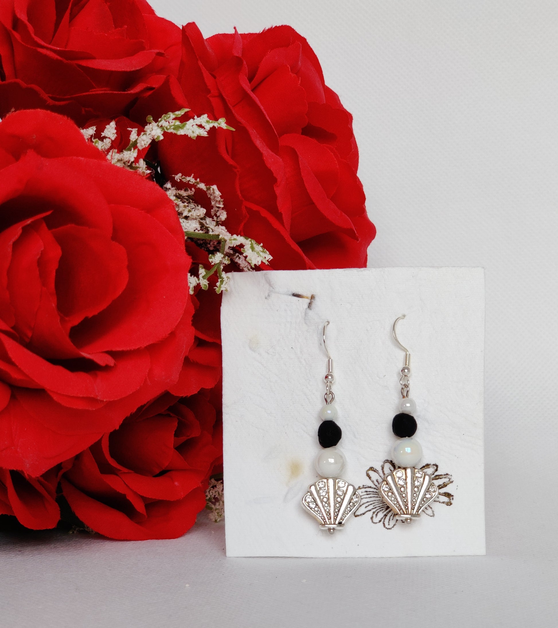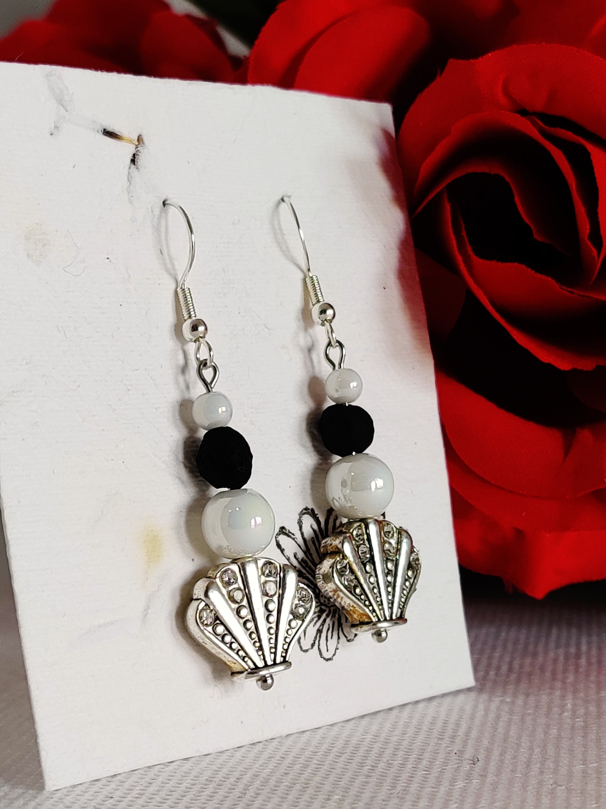 Silver and rhinestone metal sea shell beads, white pearlescent glass beads, black rose beads.