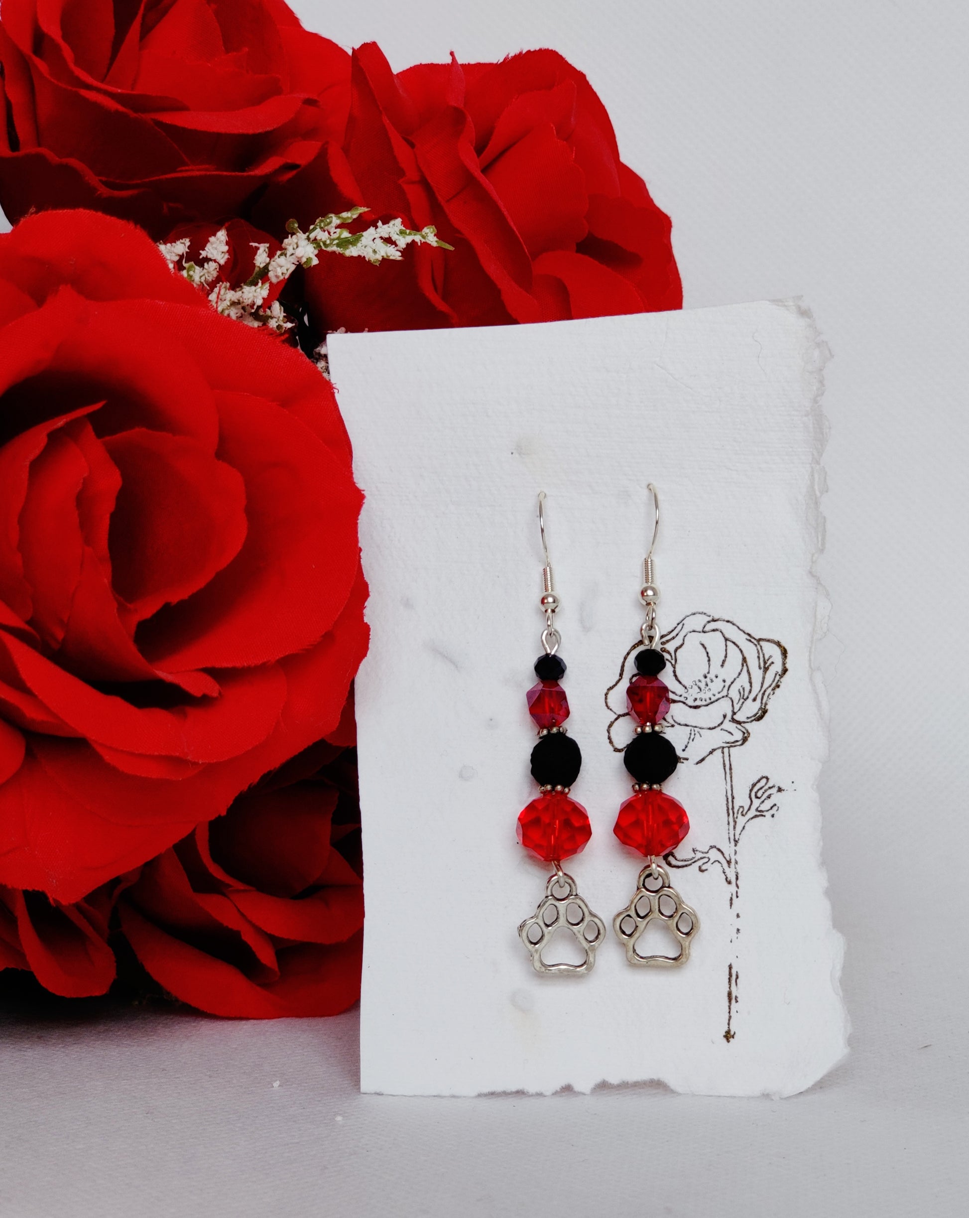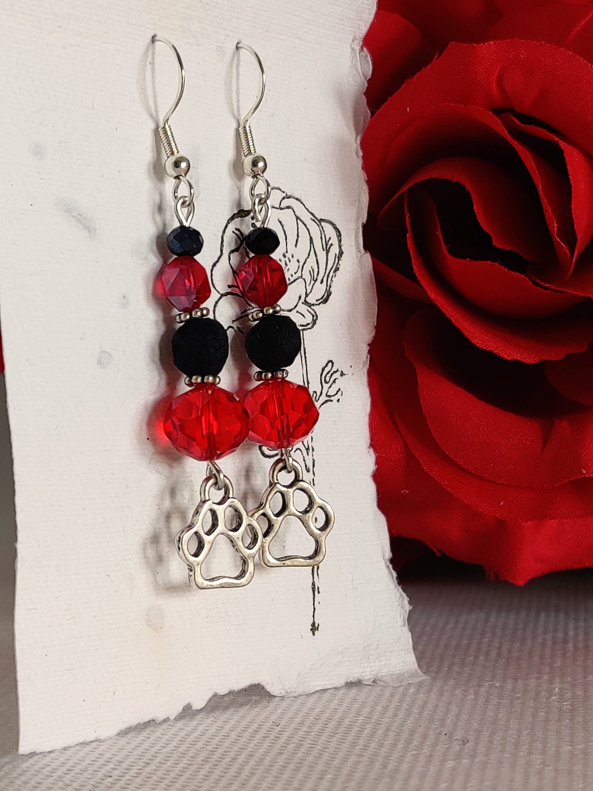 Silver metal paw charms, red faceted glass beads, black faceted glass beads, silver spacers, black rose beads.