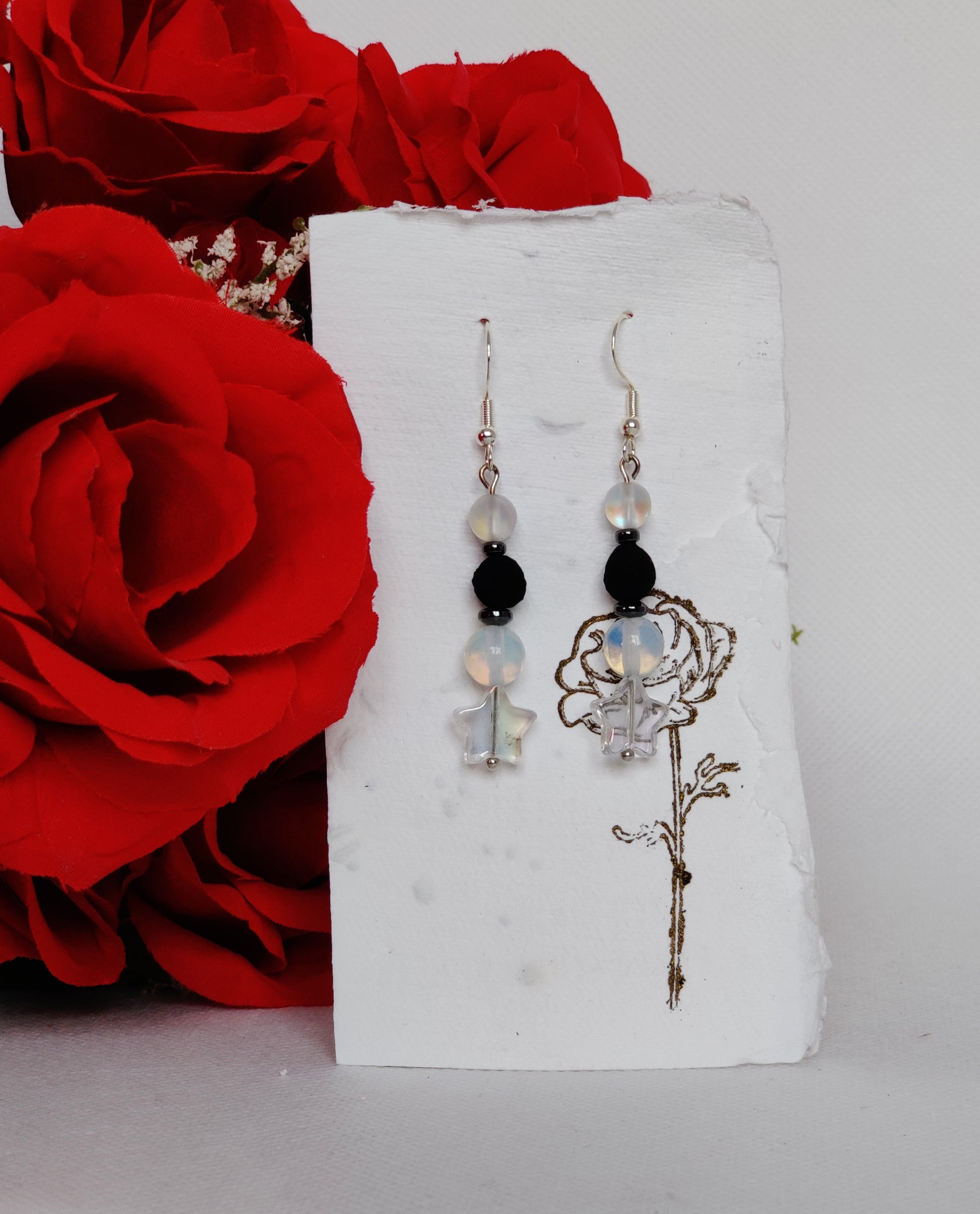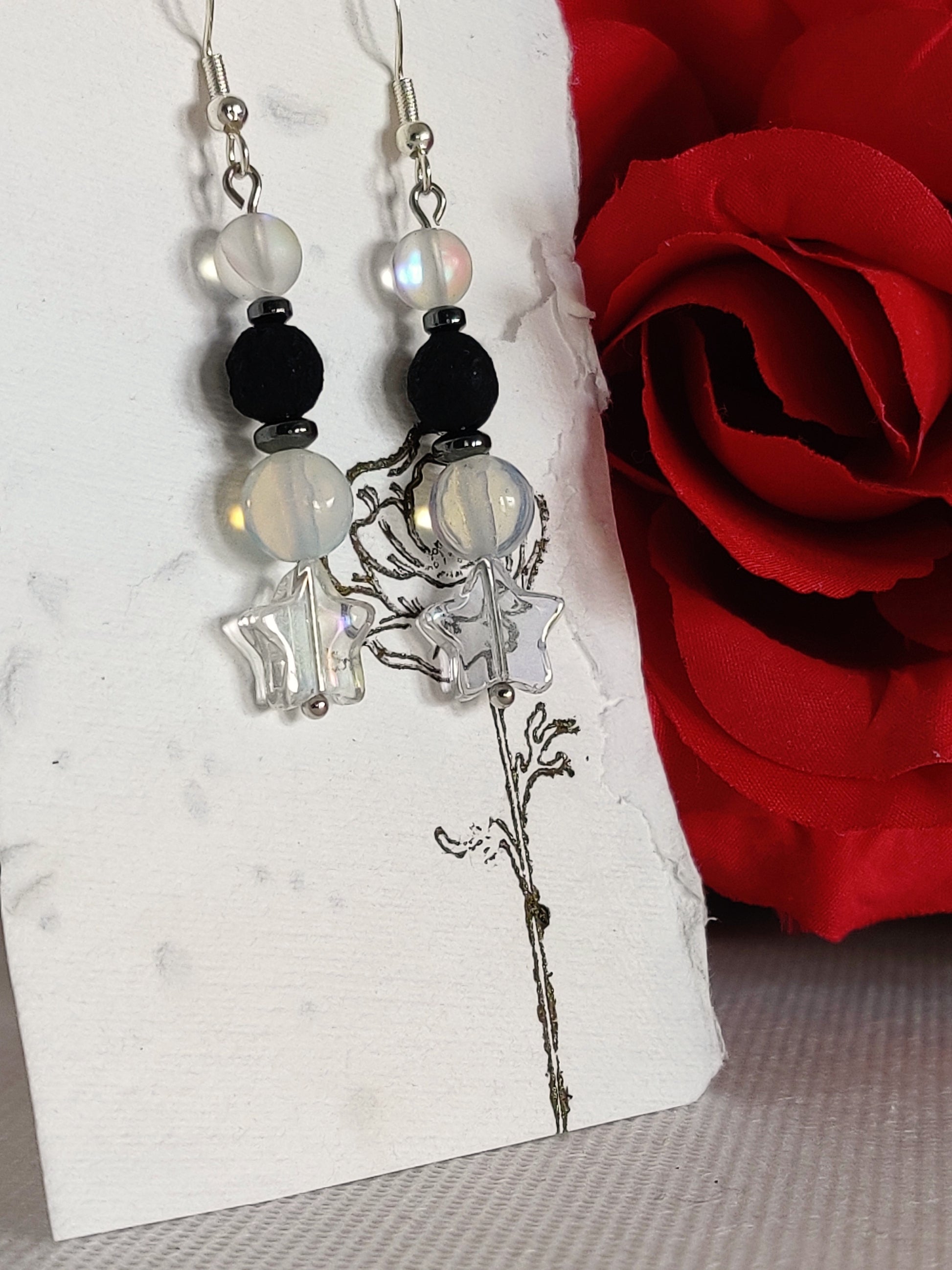 Clear aurora borealis glass stars, moonstone beads, hematite spacers, frosted clear "opal" beads, black rose beads.
