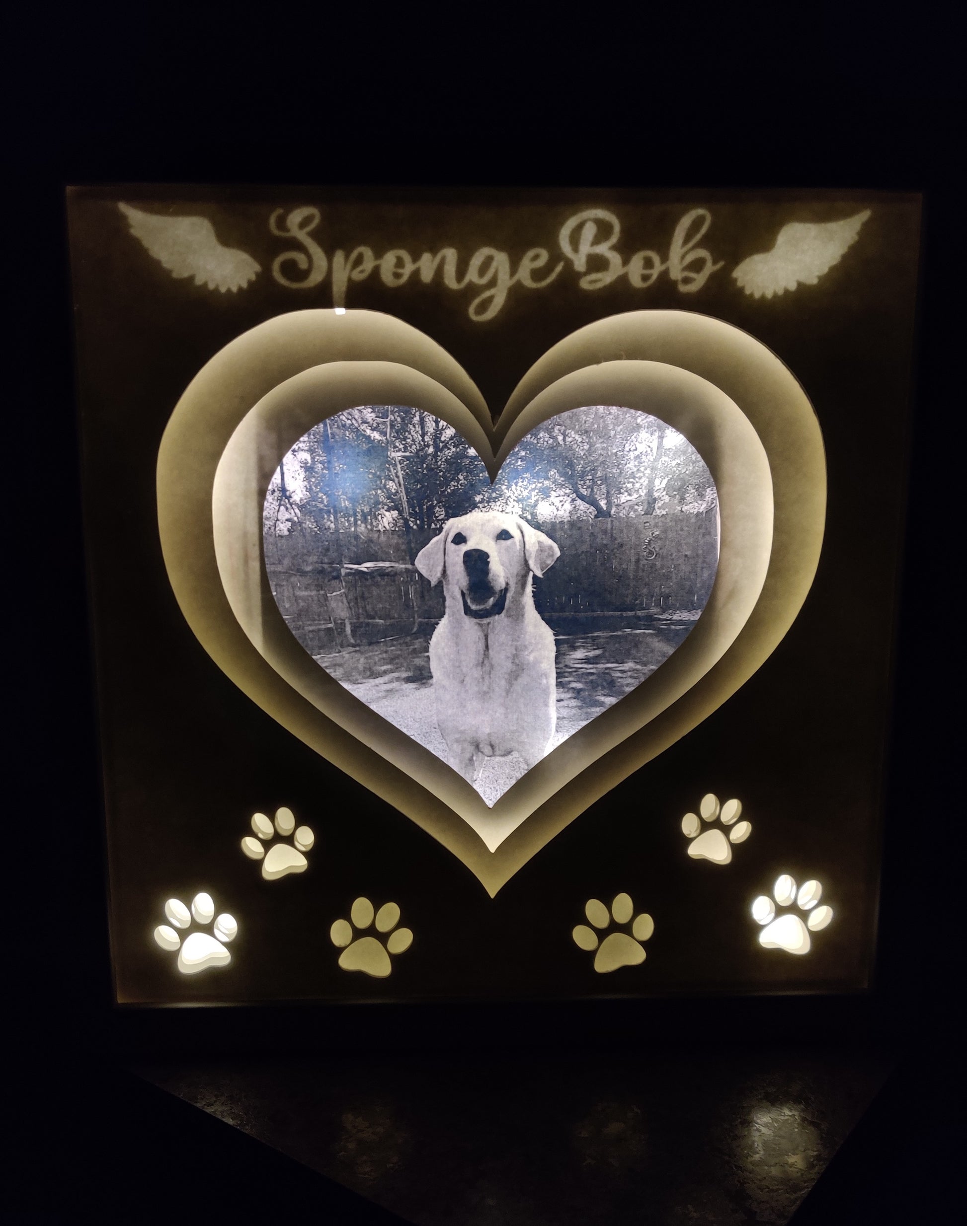 Memorialize your beloved pet with a black and white 3D paper light box. In plain daylight the box shows a heart cutout with your fur baby in the middle, and paw prints on various levels of the paper layers. When illuminated your pets name is visible with a set of wings flanking it. Each box contains fairy lights and has a battery pack that can be changed.