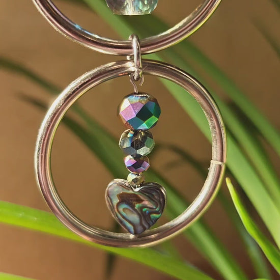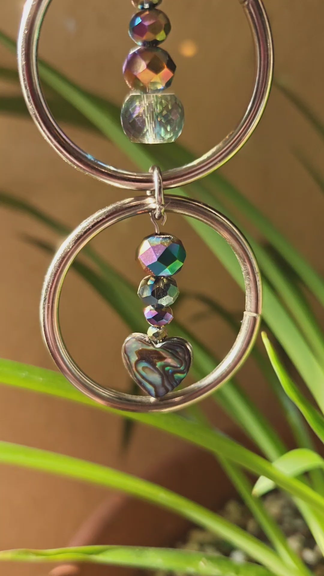 Stainless steel rings, silver tone wire, glass beads, abalone shell beads.