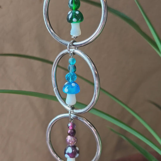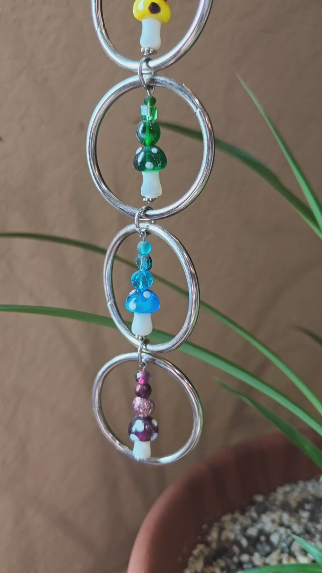 Stainless steel rings, glass beads, stone beads, silver tone wire.