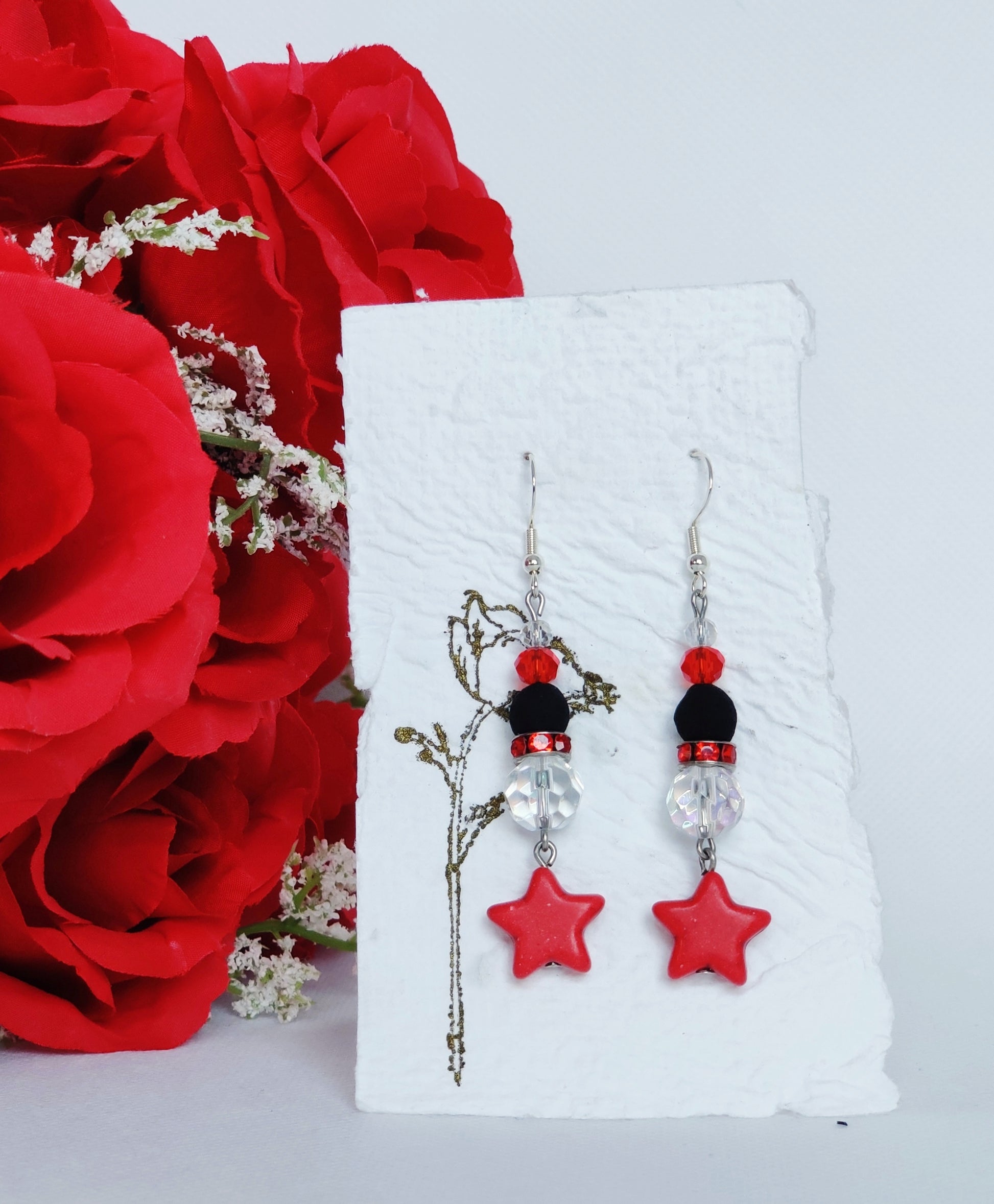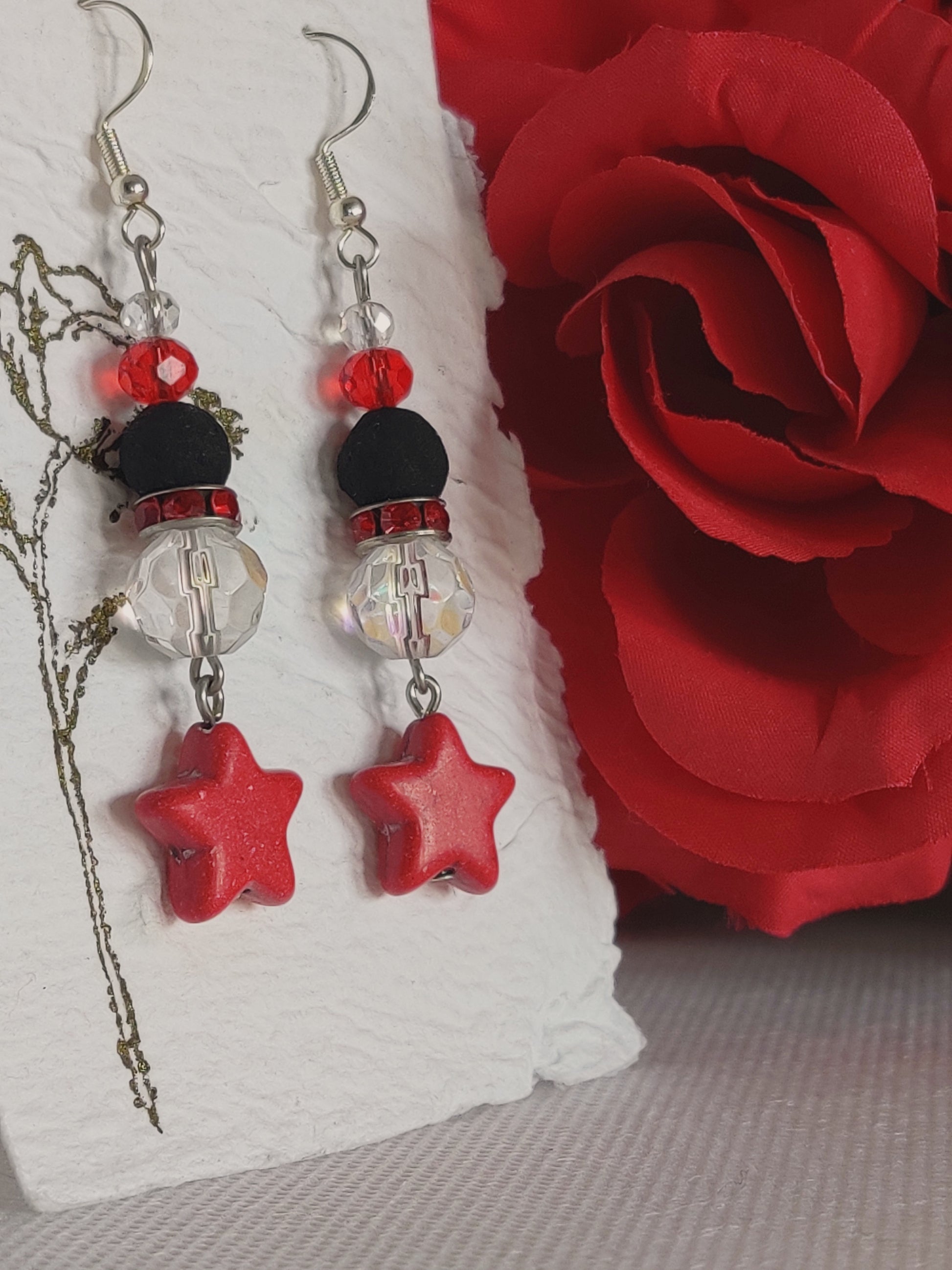 Red dyed stone stars, clear aurora borealis glass beads, red rhinestone spacers, red faceted glass beads, clear faceted glass beads, black rose beads.