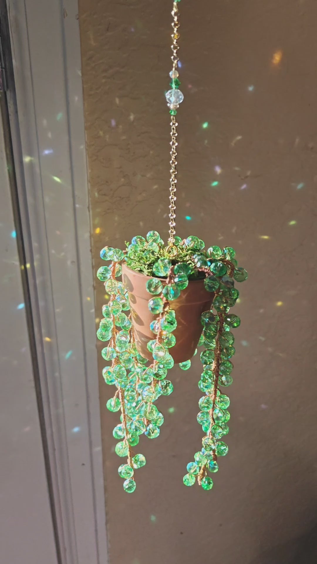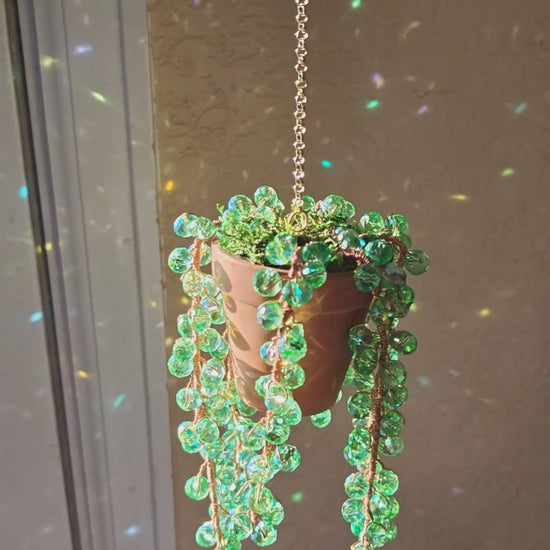 Over 180 glass beads, 55 feet of copper wire, and a terracotta pot come together to create this stunning forever string of pearls. Recommended for indoor hanging only, this sparkly sun catcher will surely stop anyone in their tracks. Hang it where the sun shines in and watch the rainbows dance around the room!
